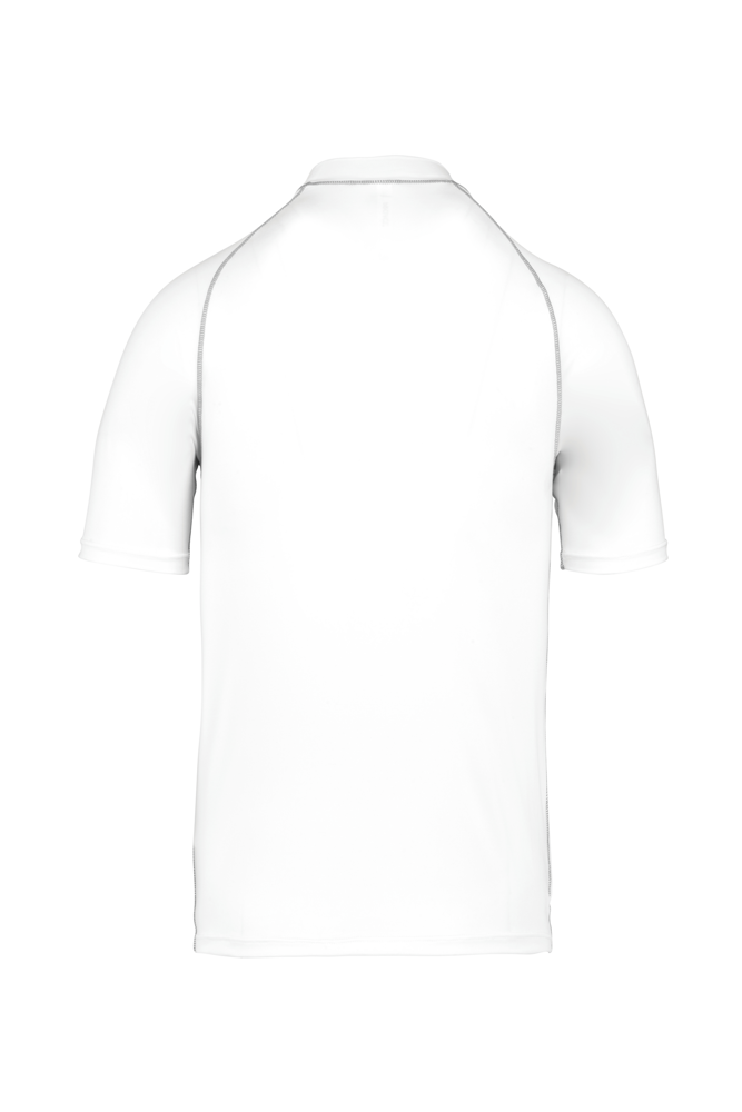 88 % Polyester / 12 % Elasthan. Dehnbarer Strick. UV 40+ Schutz ,entsprechend den Vorgaben der Norm EN13758-1&2. Kurze Ärmel. Hochgeschlossener Kragen. Sehr körpernaher Schnitt. Elastische Schnalle im Saum auf der Vorderseite zum Einführen der Kordel der Shorts, um auf diese Weise das T-Shirt zu stabilisieren. Kontrastfarbene Ziernähte. Doppelnähte an Ärmelbündchen und unterem Saum.