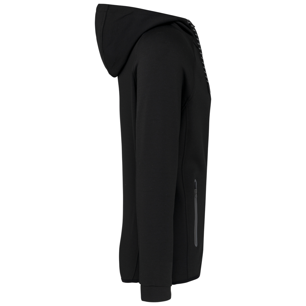 94% Polyester/ 6% Elasthan (Melierte Farben : 79 % Polyester/ 15 % Viskose/ 6 % Elasthan). Besonders bequemes Material. Reißverschluss. 2 geschweißte Reißverschlusstaschen vorne. Kapuze mit Jerseyfutter aus 65% Polyester/ 35% Viskose mit zweifarbigem Kordelzug mit Kunststoffkappen an den Enden. Schmale Ärmelbündchen mit kontrastfarbenem Elastikeinsatz. Kontrastfarbenes Schrägband am Saum. Black auf allen Farben und Dark Grey auf der Ash Heather (auch Verschlüsse).