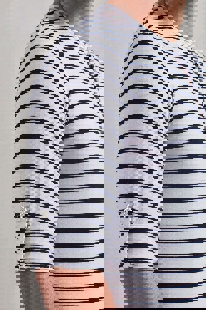 82 % Polyester / 14 % Viskose / 4 % Elasthan. Garngefärbte Streifen weiß/navy. Funktionales T-Shirt mit Krempelärmeln. Einfacher aber vielseitiger Stil zum Tragen mit langen oder hochgekrempelten Ärmeln. Das weiche Material bietet eine zwanglose, trendige Alternative zum klassischen Hemd. Krempelärmel mit Knopfleiste auf der Armvorderseite. Rundhalsausschnitt mit Knopfleiste und 3 Knöpfen. Strickbündchen an Hals und Ärmeln. Weiches, flexibles Material.