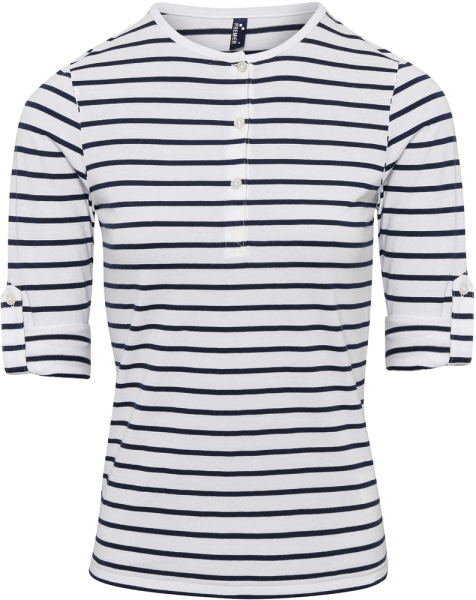 82 % Polyester / 14 % Viskose / 4 % Elasthan. Garngefärbte Streifen weiß/navy. Funktionales Damen-T-Shirt mit Krempelärmeln. Einfacher aber vielseitiger Stil zum Tragen mit langen oder hochgekrempelten Ärmeln. Das weiche Material bietet eine zwanglose, trendige Alternative zur klassischen Bluse. Krempelärmel mit Knopfleiste auf der Armvorderseite. Rundhalsausschnitt mit Knopfleiste und 3 Knöpfen. Strickbündchen an Hals und Ärmeln. Weiches, flexibles Material.