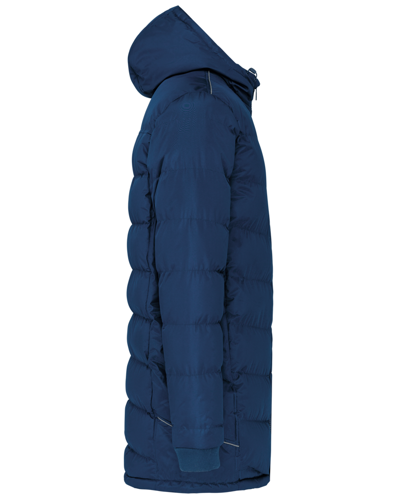 Außenstoff : 100 % Polyester 200 g/m² mit PVC-Beschichtung (wasserabweisender Behandlung). Innenstoff : 100 % Polyester 350 g/m². Futterstoff : 100 % Polyester 60 g/m². 2 Reißverschluss-Seitentaschen. 1 Innentasche. Strickbündchen an Kragen und Ärmelsaum. Reflektierende Querstreifen an Schultern und Seiten. Gefütterte Kapuze. 1 Reißverschluss an der Brusttasche und 1 Reißverschluss am Saum zur Veredelung.