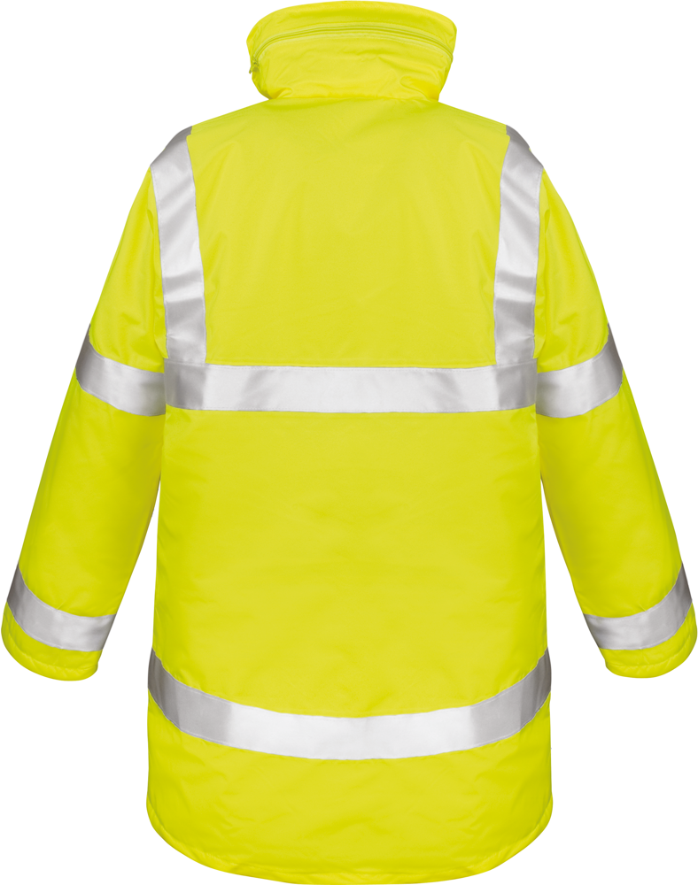 Außen: 100% Polyester (Oxford mit Polyurethan-Beschichtung). Wattierung: 140 g/qm, 100% Polyester. Futter: 100% Polyester (190T, Diamantenstepp). Diverse Taschen. Atmungsaktiv und wasserdicht (3.000 mm). Versiegelte Nähte. Verborgene Kapuze mit Kordelzug. Full Zip mit Windschutzleiste und Druckknöpfen. Lüftungsschlitze unter den Achseln. 50 mm breite Reflektorstreifen (3M™Scotchlite™). EN ISO 20471:2013 type 3, GO/RT 3279Issue 8:2013 Type 3 (nur Orange). Druckerzugang.