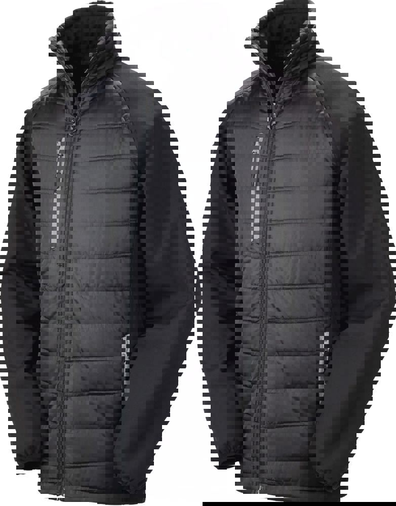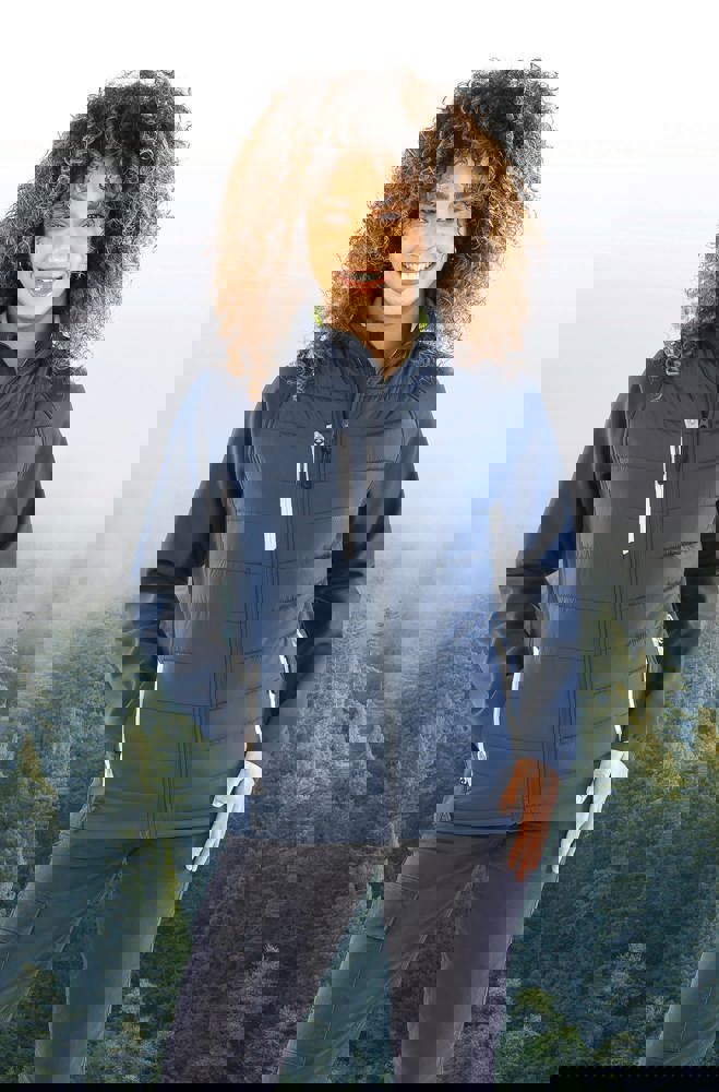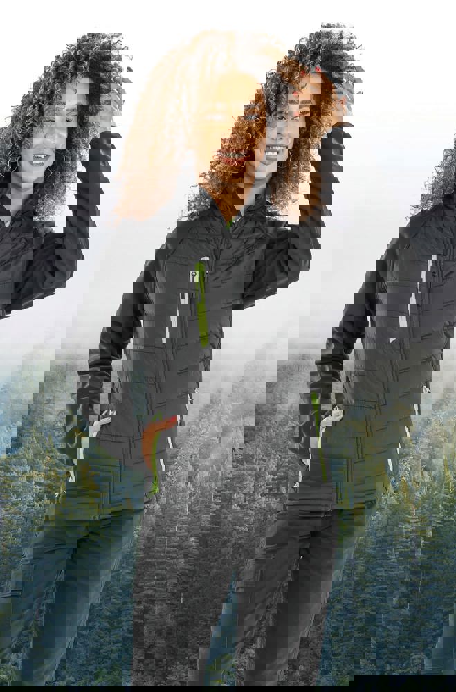 Außenmaterial: 100% JIAREN recyceltes Polyester : 180g/m² Polyester Innenfutter: 100% Polyester. Ärmel aus 280g/m² 2- lagigem technischem Material: Außen: 100% Polyester Innen: 100% Polyester Microfleece. Durchgehender Reißverschluss vorne mit Kinnschutz. Gepolsterter Stehkragen. Kontrastfarbene Details an Brust-und Seitentaschen mit schwarze Reißverschlussschiebe. Wattierter, gesteppter Körperbereich. Eingefasste, weiche Bündchen. Sehr weich, leicht und warm. Veredelungszugang: verdeckter Reißverschluss im Brustbereich links.