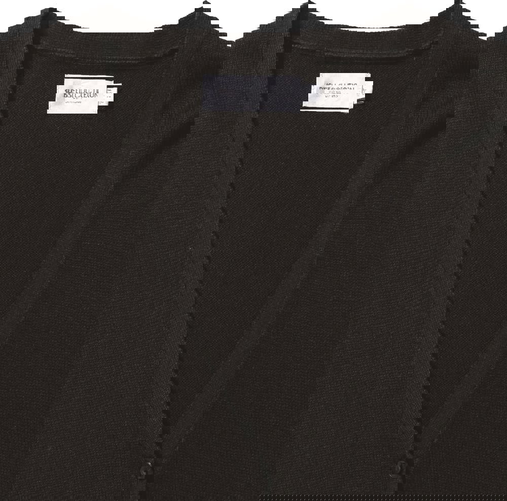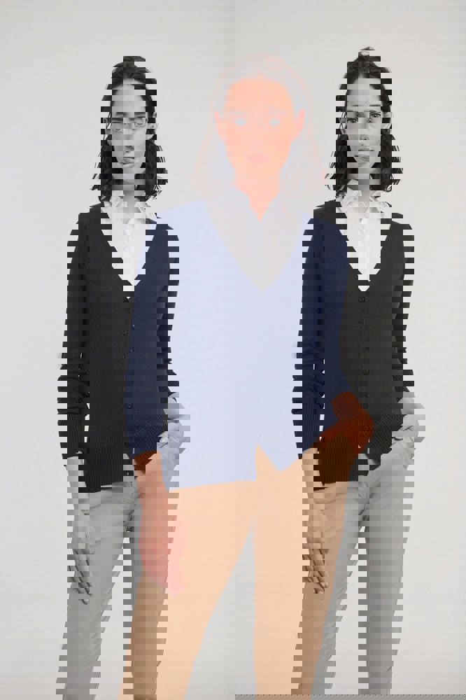 50% Baumwolle /50% Polyacryl. Pflegeleichtes CottonBlend Material. Glattgestrickt. V-Ausschnitt mit Rippstrickbündchen. Farblich abgestimmte Knöpfe. Ärmelabschluss und Bund mit breitem Rippstrickbündchen. Seitennähte.