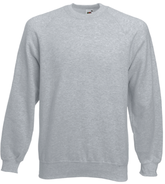 White und Heather Grey 260g/m² . 80% Baumwolle / 20% Polyester (außer Dark Heather Grey 60% Baumwolle / 40% Polyester). Raglanärmel. Rippstrick an Kragen, Ärmel- und Taillenbund in Baumwolle/Lycra®. Schlauchware.