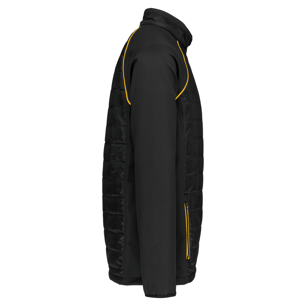 100 % Polyester. Zweilagige Softshell, 4-Wege-Stretch für mehr Tragekomfort mit Fleecefutter an Ärmeln und Schultern für optimale Wärme. Vorderseite und Rücken : 100 % Polyester, 75 g Taft 230T mit Beschichtung. Stoff mit wasserabweisender Behandlung. 2 Reißverschlusstaschen auf der Vorderseite. 1 Namensschild innen links. Kontrastfarbene Paspel an Ärmelbündchen und auf der Krageninnenseite. Reißverschluss auf der Vorderseite und kontrastfarbene Taschen. Unsichtbarer Reißverschluss zur Veredelung am Saum. Ideal für eine tägliche Nutzung.