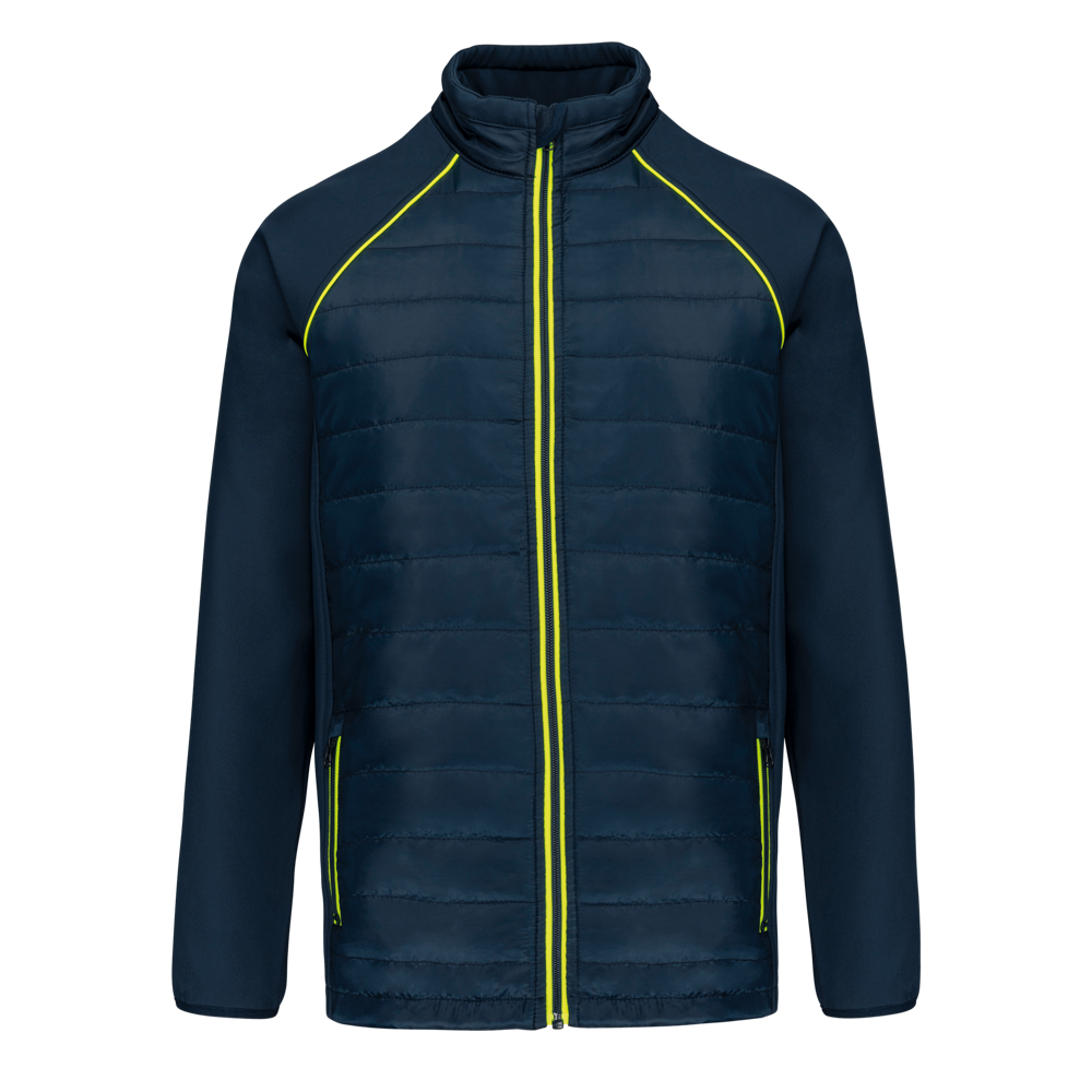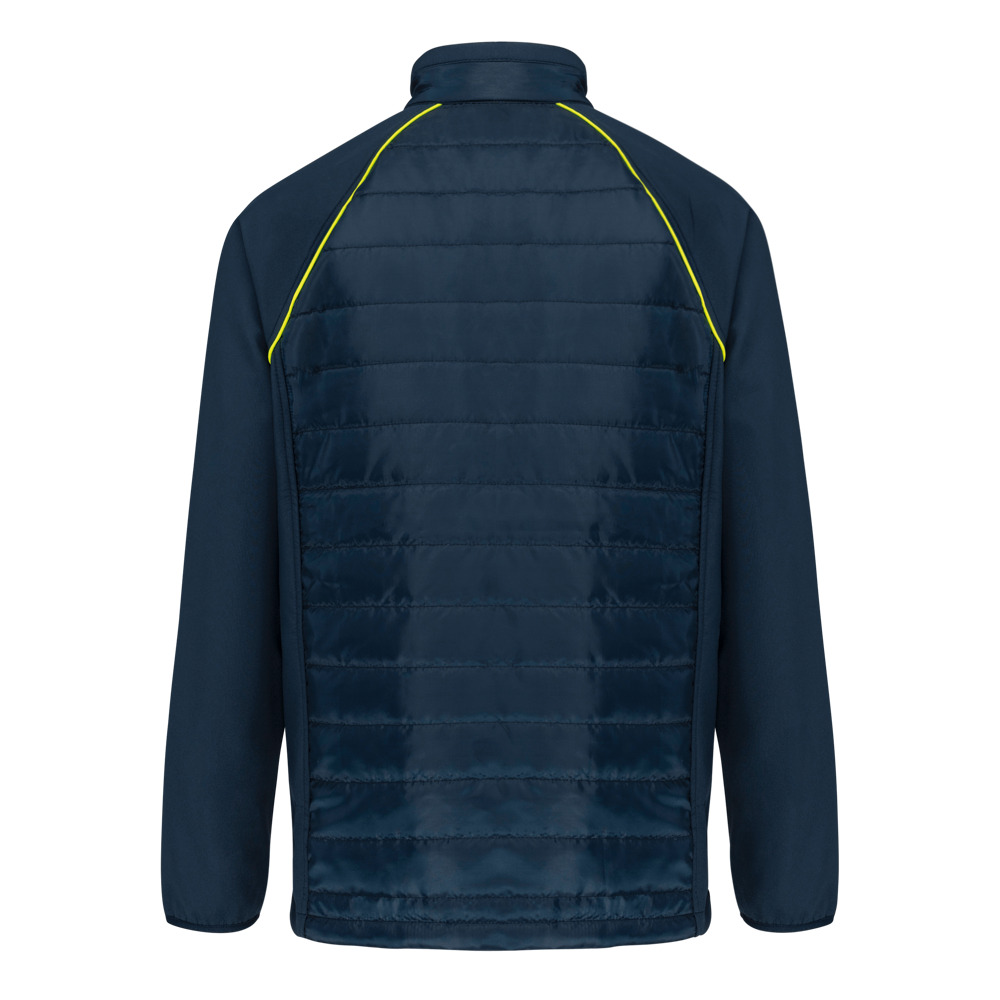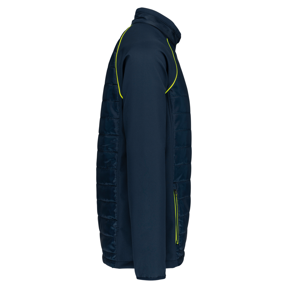 100 % Polyester. Zweilagige Softshell, 4-Wege-Stretch für mehr Tragekomfort mit Fleecefutter an Ärmeln und Schultern für optimale Wärme. Vorderseite und Rücken : 100 % Polyester, 75 g Taft 230T mit Beschichtung. Stoff mit wasserabweisender Behandlung. 2 Reißverschlusstaschen auf der Vorderseite. 1 Namensschild innen links. Kontrastfarbene Paspel an Ärmelbündchen und auf der Krageninnenseite. Reißverschluss auf der Vorderseite und kontrastfarbene Taschen. Unsichtbarer Reißverschluss zur Veredelung am Saum. Ideal für eine tägliche Nutzung.