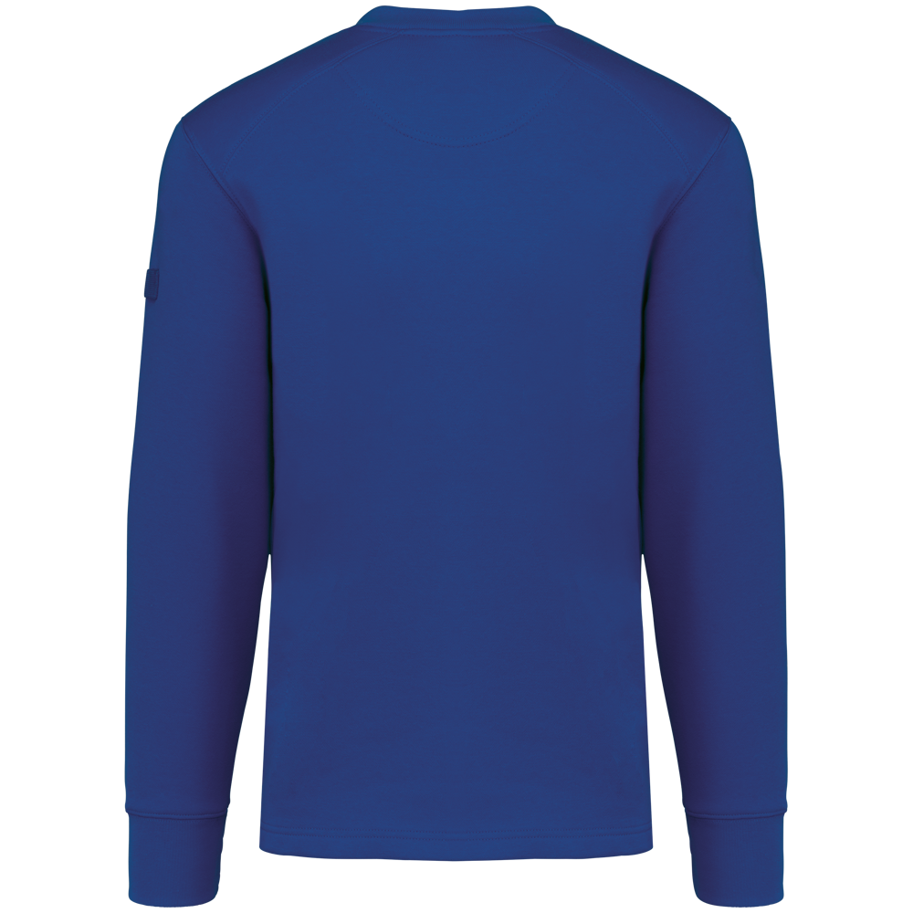 80 % Baumwolle / 20 % Polyester. 3-Faden-Fleece mit LSF-Behandlung (Low Shrinkage Fleece). Bei 60 °C waschbar. Rundhalsausschnitt und Ärmelbündchen aus Strick. Unsichtbare Reißverschlusstasche rechts. Verstärkungen an Schultern und Ärmeln für mehr Strapazierfähigkeit. Stifthalter am linken Ärmel. Halbmond-Finish auf der Rückseite. Befestigungshaken im Kragen. Doppelnähte am Saum und verlängerter Rücken für mehr Komfort.