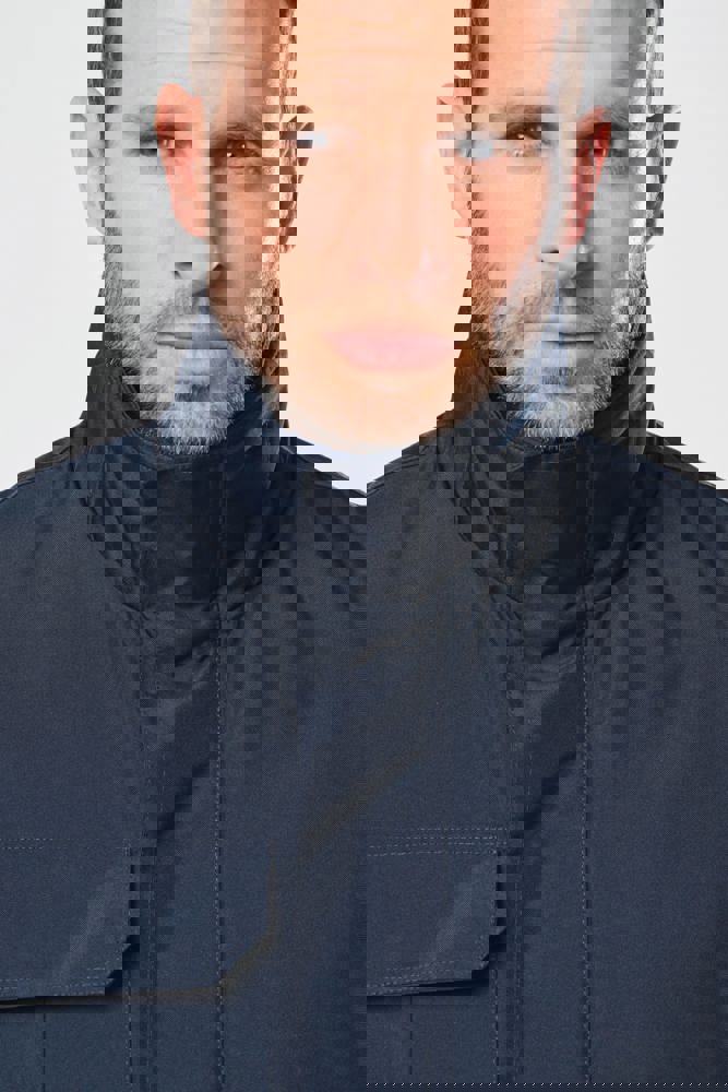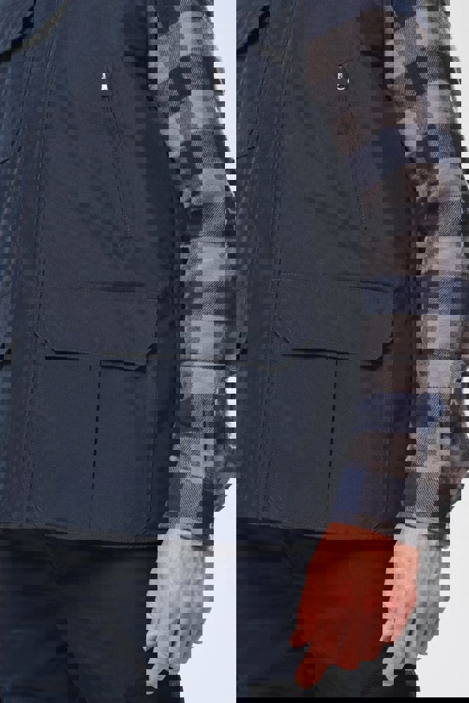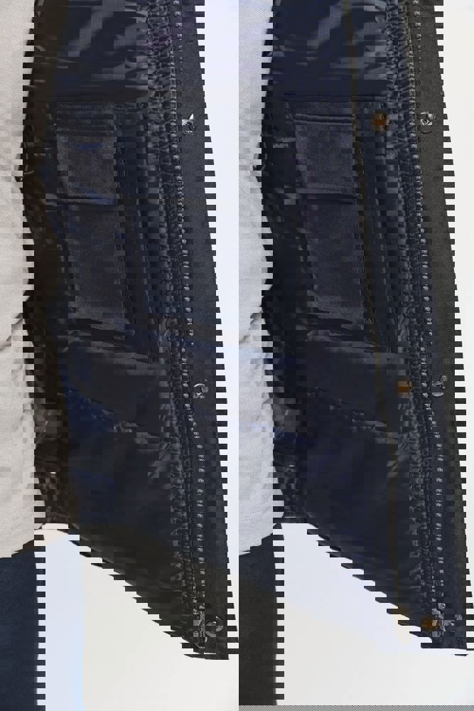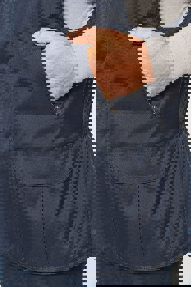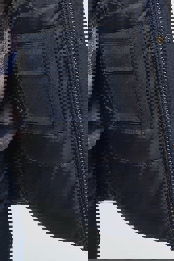 100 % Polyester. Außen: 100% Oxford Polyester mit PVC Beschichtung innenseitig. Steppfutter: 100% Polyester-Wattierung. Durchgehender verdeckter Reißverschluss. 4 Außentaschen (3 Taschen mit Klappe + 1 mit Reißverschluss). Verdecktes, elastisches Band. 2 Innentaschen (1 mit Reißverschluss und 1 fürs Handy). Reißverschluss für leichtes Veredeln.
