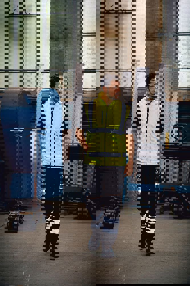 100% Polyester. 3 Schichten. wasserdicht 8.000 mm. Außenschicht: 100% Polyester. Mittelschicht: TPU wasserdicht. Innenschicht: Microfleece. 100% wasserdichte Reißverschlüsse & Reißverschluss mit Markenname an Vorder- und Brusttasche. 2 Handwärmetaschen mit Reißverschluss. Verlängertes Rückenteil. 5 cm Reflexstreifen rund um den Körper und einer über jeder Schulter. Hi Vis Yellow & Hi Vis Yellow/Navy, Hi Vis Orange und Hi Vis Orange/Navy gemäß EN ISO20471:2013 Klasse 2.