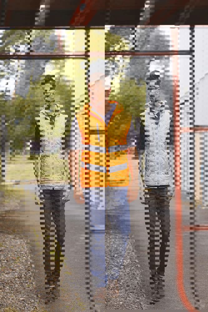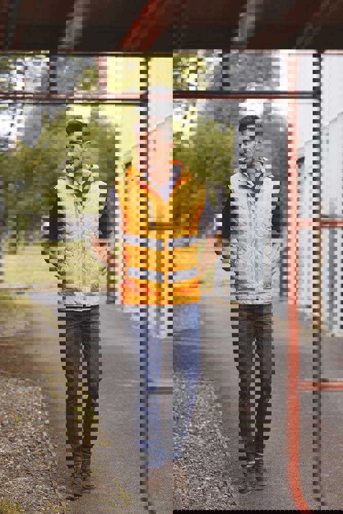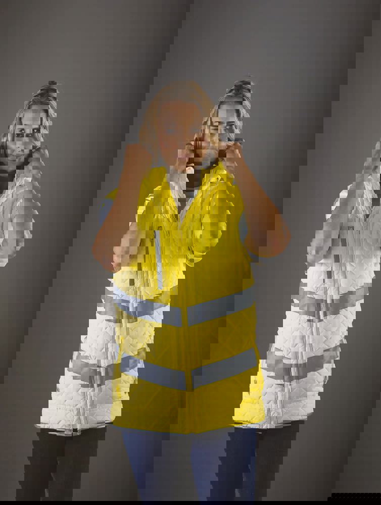 Wasserabweisendes Außenmaterial 100 % Polyester mit Fleecefutter und Steppfutter aus 100 % Polyester. 2 reflektierende Streifen (5 cm breit) in V-Form am Rumpf für bessere Sichtbarkeit. Hoher Kragen mit integriertem Kinnschutz. Brusttasche mit Zipper. 2 seitliche Taschen mit Reißverschluss zum Wärmen der Hände. 1 aufgesetzte Tasche im eingenähten Fleece-Futter. Reflektierende Paspel am Saum. Unsichtbarer Reißverschluss zur Veredelung am unteren Saum (Innenseite). Entspricht der Norm EN ISO 20471:2013 Kategorie 2 (nur Hi-Vis Yellow und Hi Vis Orange) und der Norm UK GO/RT 3279 Issue 8:2013 für Bahn-Warnkleidung (nur Hi Vis Orange).