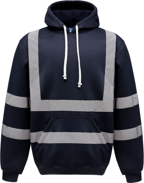 100 % pillingfreies Polyester. 2 reflektierende Streifen (5 cm breit) um Rumpf und Arme. Je ein reflektierender Schulterriemen. Nackenband im Halsausschnitt. Angesetzte Kapuze (in der Verlängerung des Halsausschnitts) mit Kordelzug. Eingesetzte Ärmel. Kängurutasche vorne. Strickbündchen an Ärmeln und Saum. Doppelnähte an Hals, Ärmelbündchen und Saum. Norm EN ISO 20471 Kategorie 3 : Hi-Vis Yellow, Hi-Vis Orange, Hi-Vis yellow/Navy, Hi-Vis Orange/Navy.