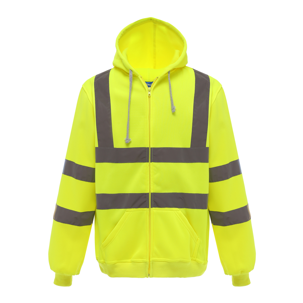100% fusselfreies, weiches, gestricktes Single-Jersey-Polyestergewebe. Zwei 5 cm breite Reflexstreifen um Körper und Arme, und einer über jeder Schulter. Kapuze mit Kordelzug; Reißverschluss in voller Länge; abgesenkte Schulter; gestrickte Rippbündchen; zwei Handwärmetaschen; durchgehend Doppelnähte; Hi Vis Yellow, Hi Vis Orange, Hi Vis Yellow/Navy und Hi Vis Orange/Navy entsprechen EN ISO 20471 Klasse 3; Hi Vis Orange & Hi Vis Orange/Navy sind auch UK GO/RT 3279 Bahn-Warnkleidung zertifiziert; Black & Navy bieten verbesserte Sichtbarkeit.