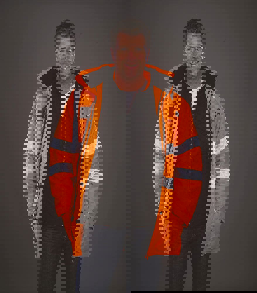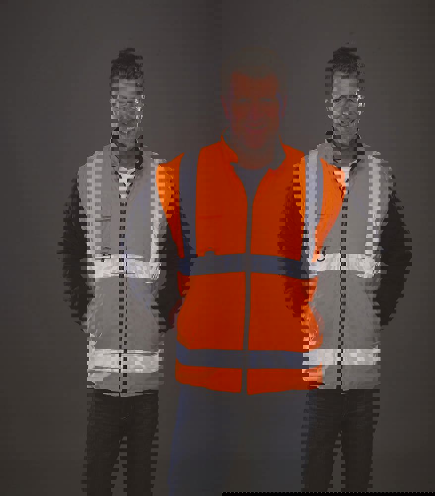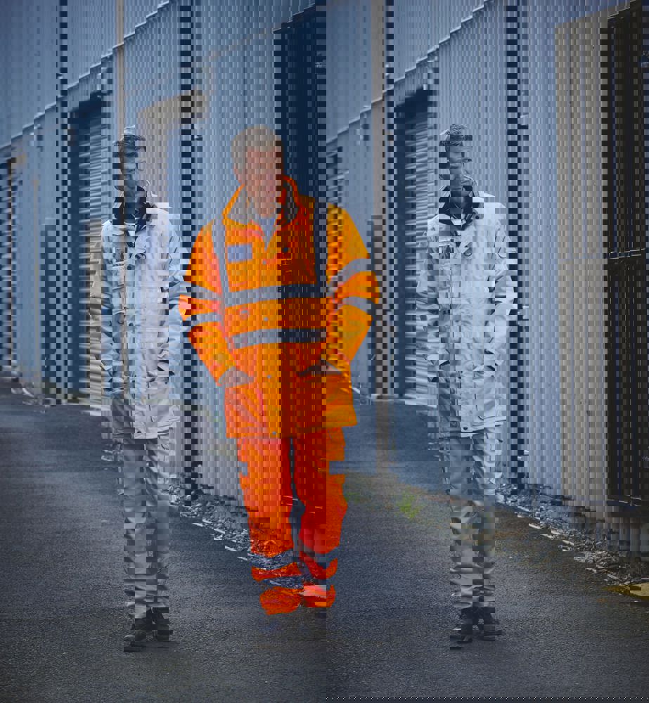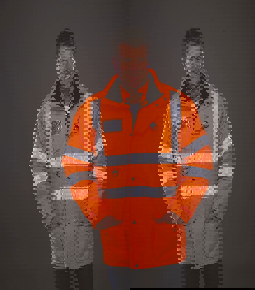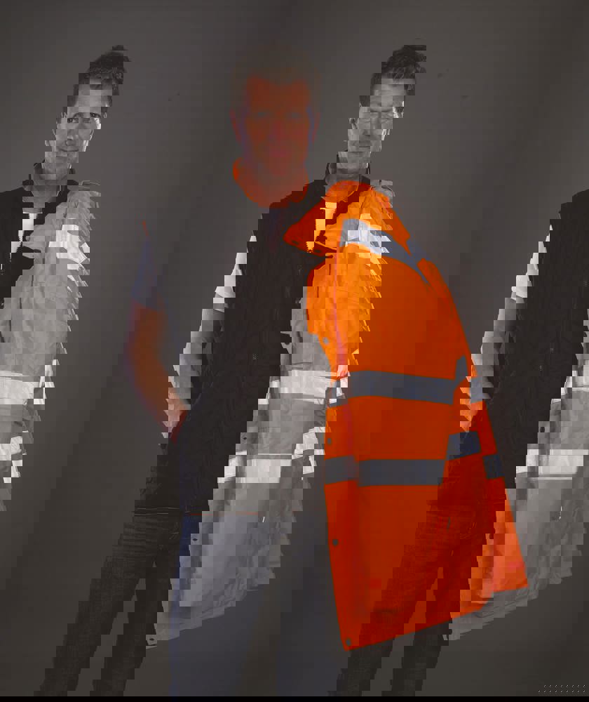 Äußere Jacke: 300D Oxford Polyester, PU-Beschichtung. Mit Mesh-Innenfutter. Atmungsaktiv und wasserdicht. Vollständig genähte und verschweißte Nähte. Zwei externe Handwärmetaschen. Verdeckte abnehmbare Kapuze. Handy & ID-Taschen auf der Brust. Hi Vis Yellow & Hi Vis Yellow/Navy, Hi Vis Orange und Hi Vis Orange/Navy gemäß EN ISO20471: 2013 Klasse 3. Hi Vis Orange und Hi Vis Orange/Navy auch GO/RT 3279.Innenjacke: Reißverschluss zum Herausnehmen der Innenjacke. Abnehmbare Ärmel für eine Thermoweste in Warnfarbe oder wendbar als schwarze Thermoweste für Jacken in Hi Vis Yellow und Hi Vis Orange, und Thermoweste in Navy für zweifarbige Jacken. Zwei Taschen auf beiden Seiten.