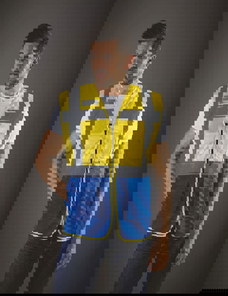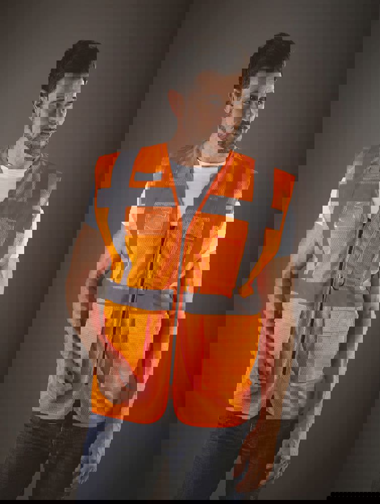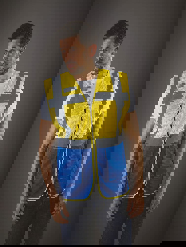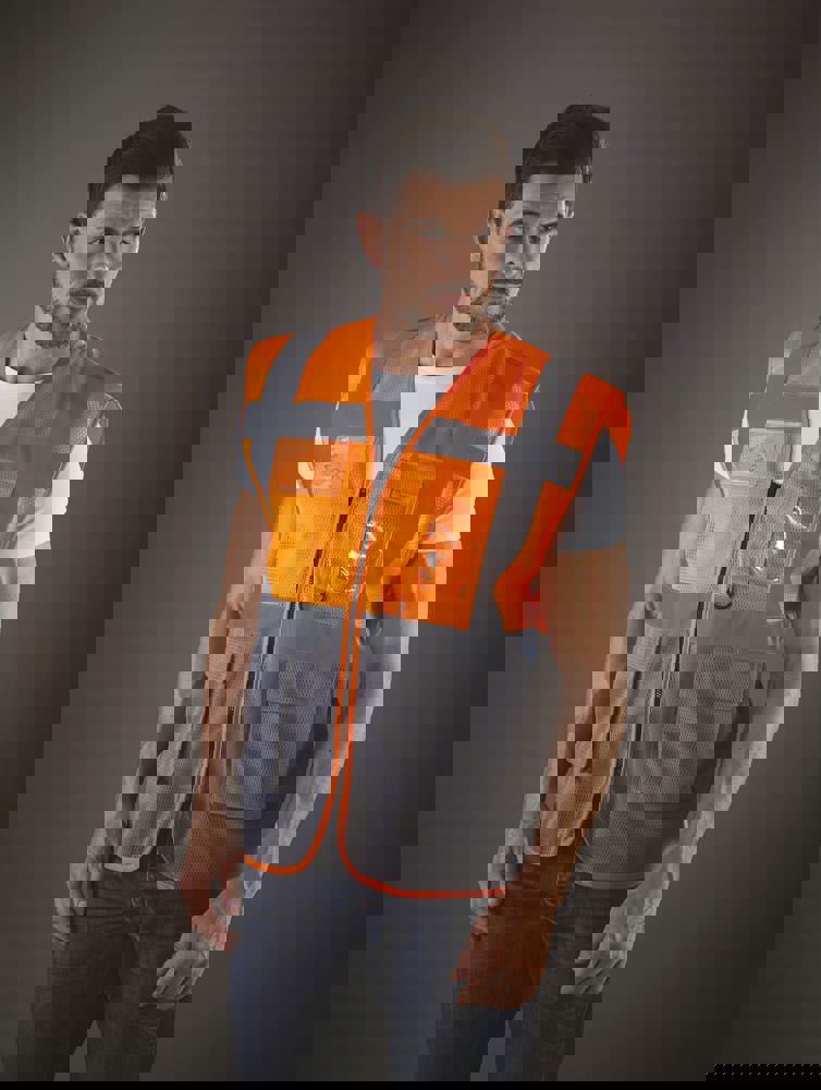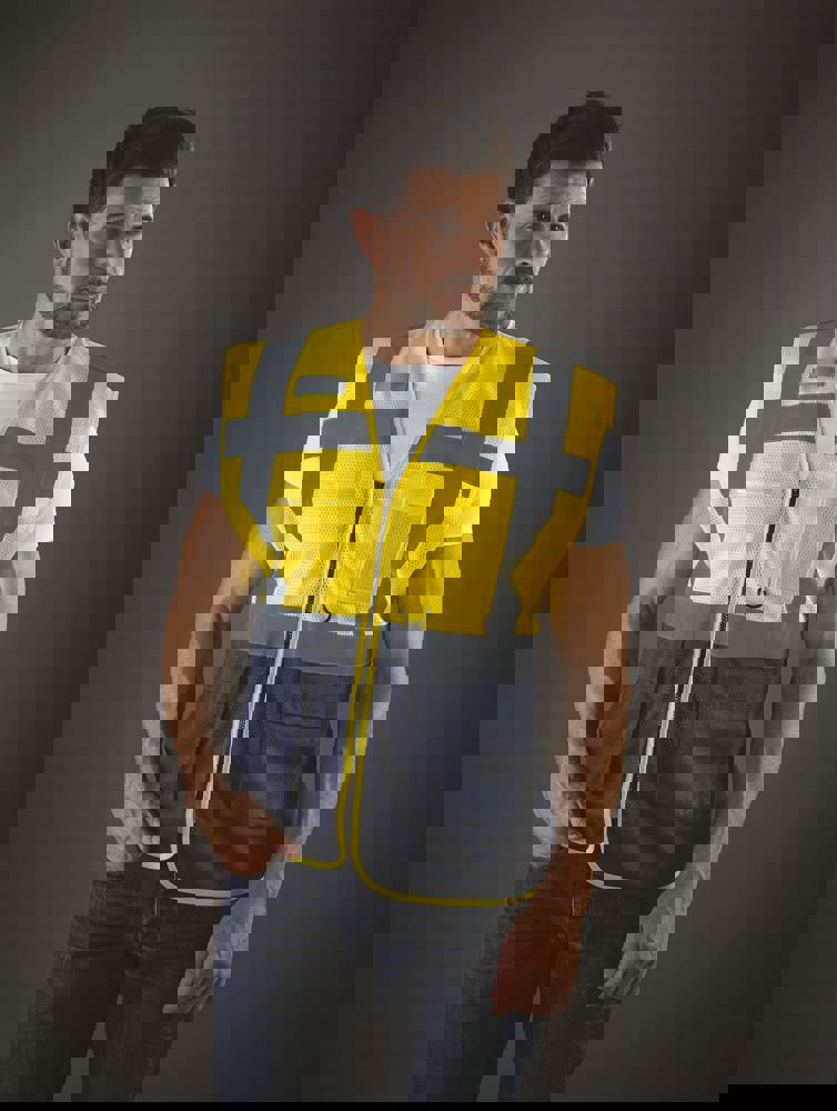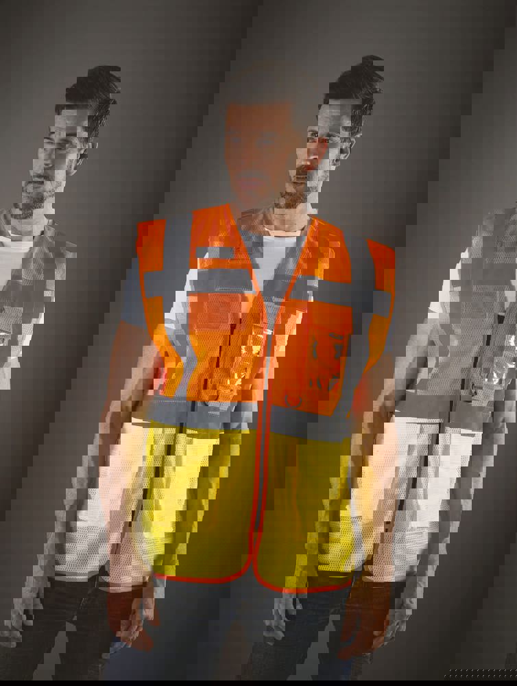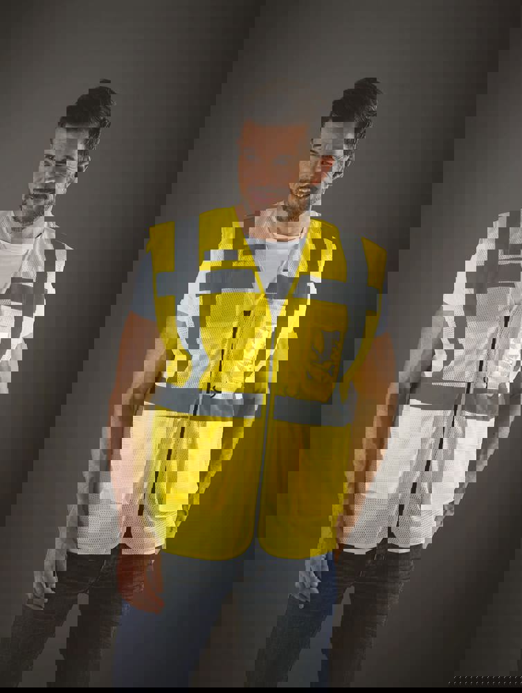 100% polyester. 100 % recycelter Polyester. Hergestellt aus PET-Kunststoffflaschen. Leichter atmungsaktiver Netzstoff. 5cm breite reflektierende Streifen am Körper und an den Schultern. Reißverschluss vorne. Viele Taschen und eine Schlaufe : Handytasche links, 2 Taschen mit Klappe mit doppeltem Zugang oben und seitlich, Stift- und Schlüsseltasche, transparente Brusttasche rechts für Ausweise. Entspricht der Norm EN ISO 20471:2013 Kategorie 1 & 2.