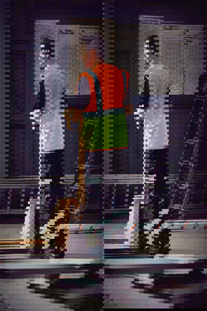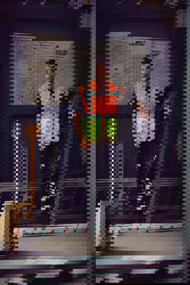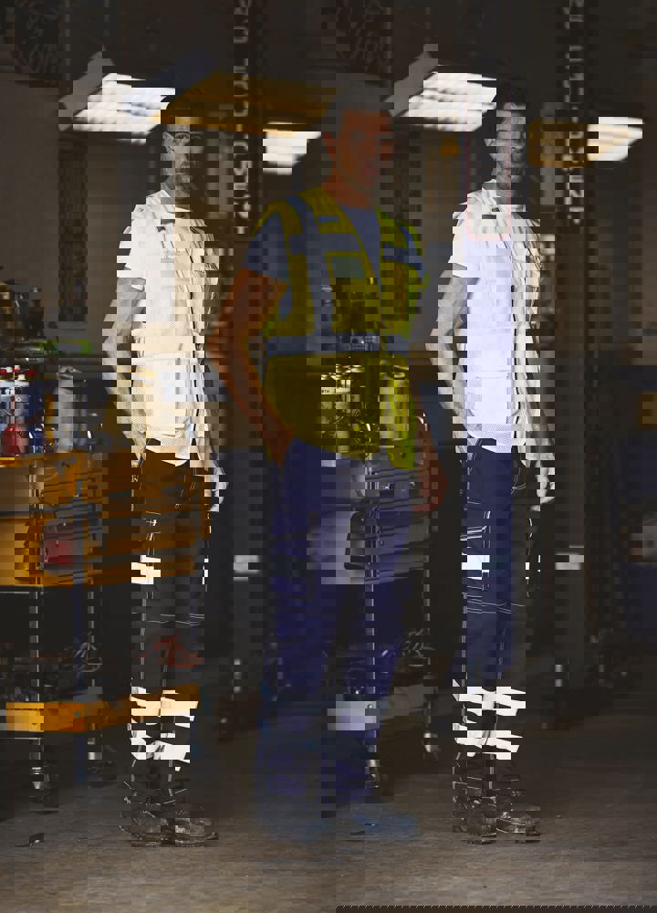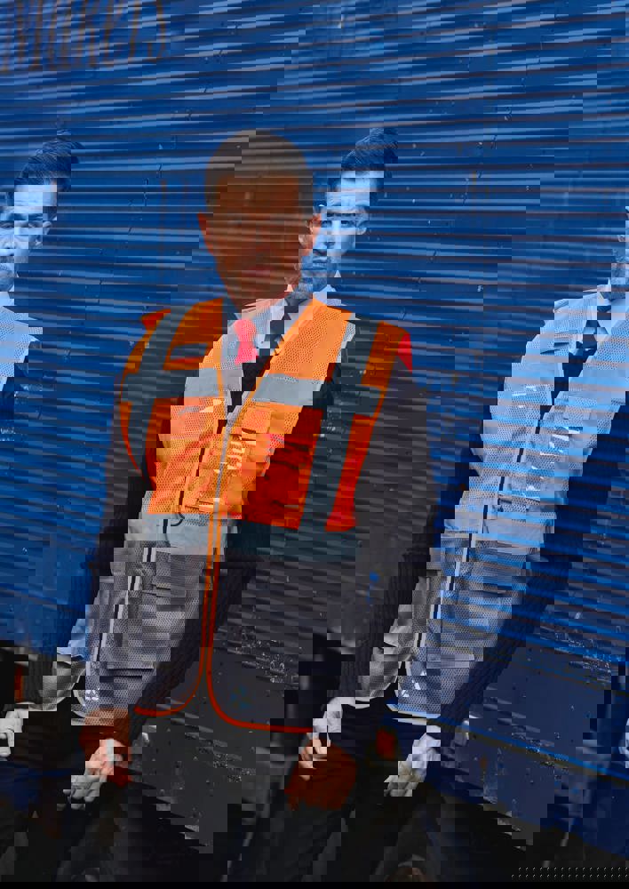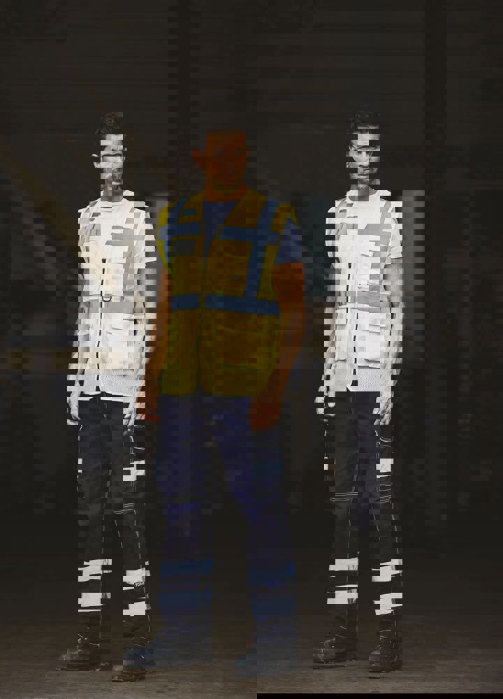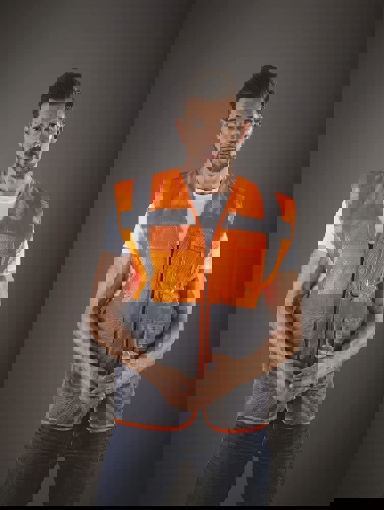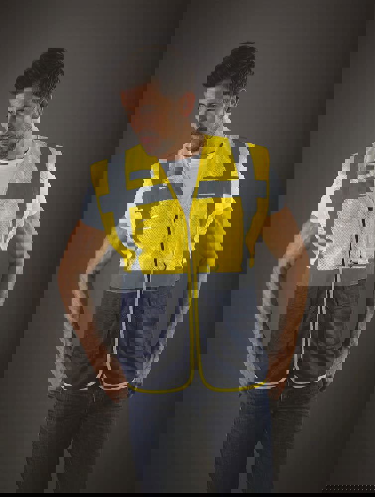 100% polyester. 100 % recycelter Polyester. Hergestellt aus PET-Kunststoffflaschen. Leichter atmungsaktiver Netzstoff. 5cm breite reflektierende Streifen am Körper und an den Schultern. Reißverschluss vorne. Viele Taschen und eine Schlaufe : Handytasche links, 2 Taschen mit Klappe mit doppeltem Zugang oben und seitlich, Stift- und Schlüsseltasche, transparente Brusttasche rechts für Ausweise. Entspricht der Norm EN ISO 20471:2013 Kategorie 1 & 2.