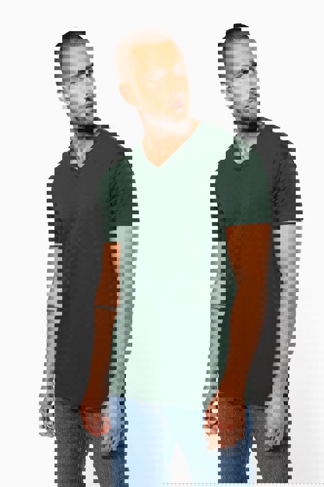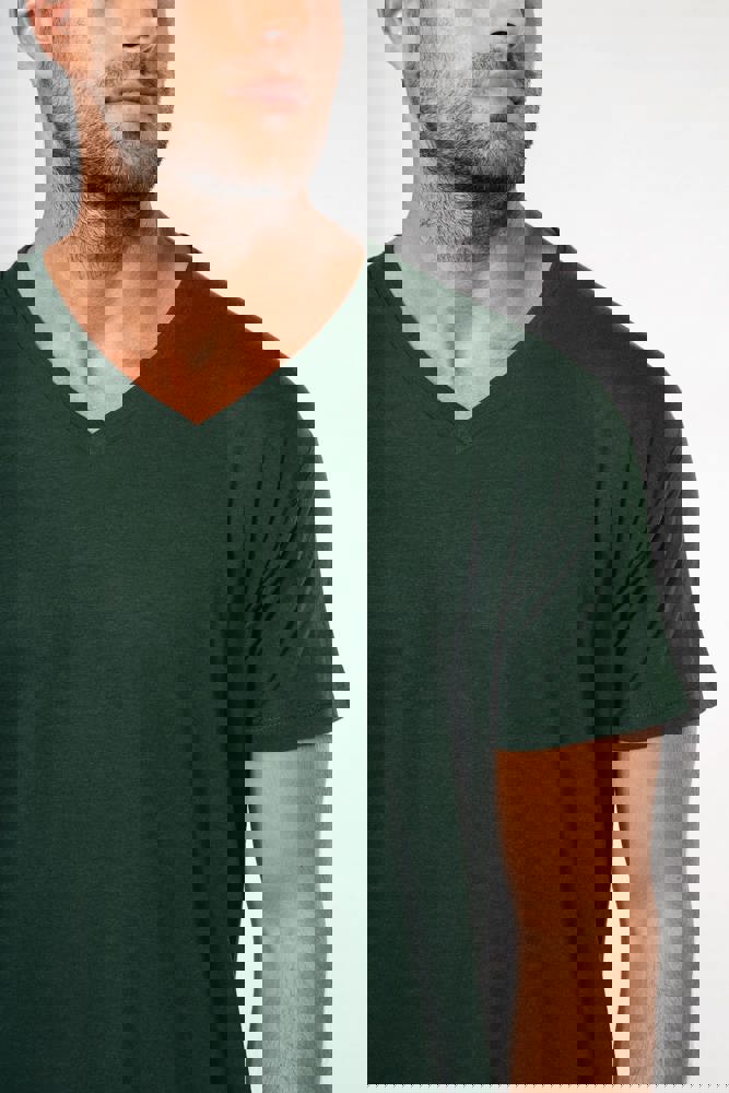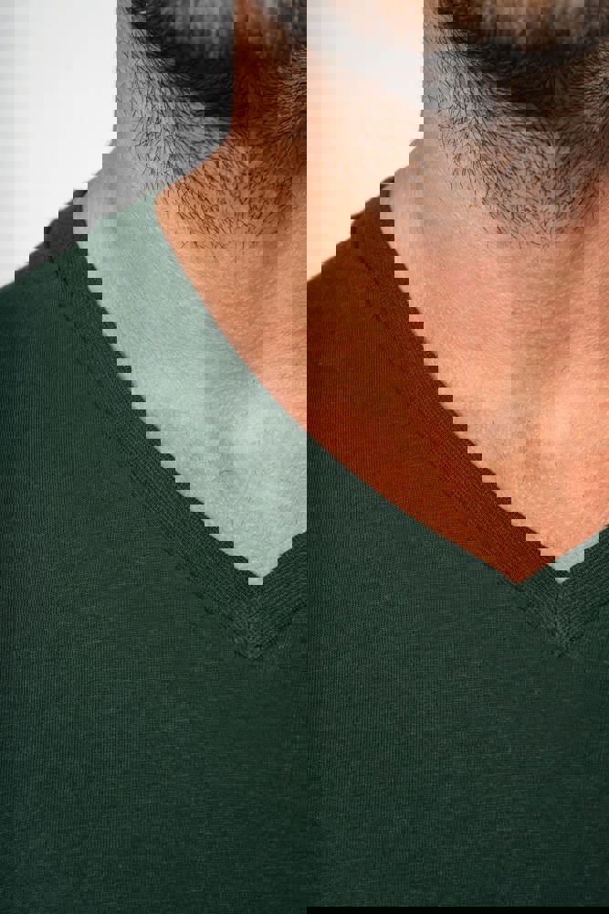 Uni : 100 % Baumwolle. Farbton Ash Heather 98 % Baumwolle / 2 % Viskose und Oxford Grey : 90 % Baumwolle / 10 % Viskose. Alle Farben werden aus biologischer Baumwolle in Umstellung hergestellt. Gekämmte Baumwolle. V-Ausschnitt mit Strickbündchen und Elasthan. Farblich abgestimmtes Nackenband. Schlauchware. Doppelnähte an Ärmelbündchen und unterem Saum.