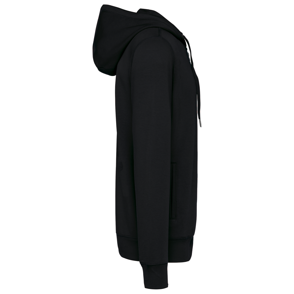 80 % biologischer Baumwolle / 20 % recyceltem Polyester post-consumer. Oxford Grey 75% biologischer Baumwolle / 25% recyceltem Polyester post-consumer. Ungebürstetes LST-Molton (Low Shrinkage Terry). Stoff: Enzymwaschung. Gerader Schnitt. 2 Paspeltaschen auf der Vorderseite. Metall-Reißverschluss. Strickbündchen an Ärmeln und Saum, gefütterte Kapuze mit Ton-in-Ton Kordelzug und Metallspitze. Halbmondförmiger Halsausschnitt auf der Rückseite für eine einfache Markenveredelung auf der Innenseite. Fischgrätnackenband. Kein Markenetikett am Kragen, nur Größenkennzeichnung, für eine leichtere Veredelung.