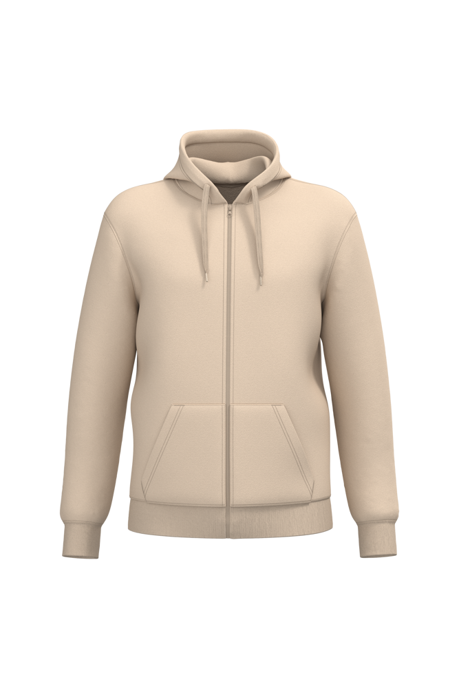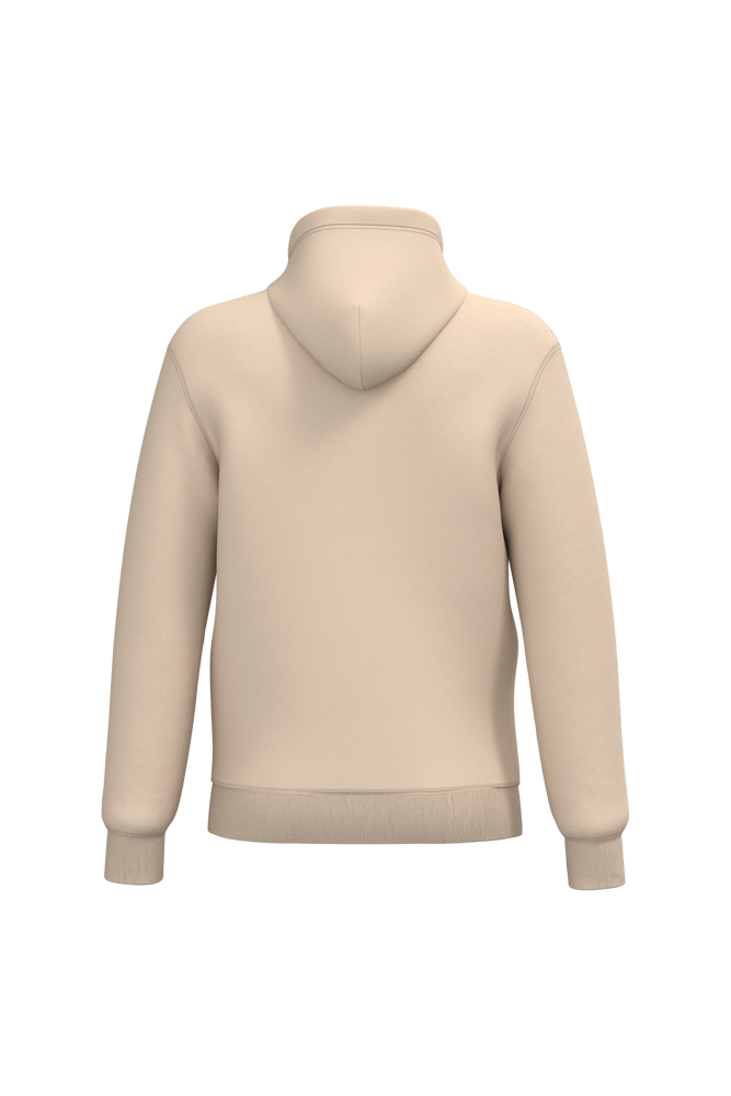 50 % Ringspun-Baumwolle / 50 % recycelter Polyester post-consumer. Gebürstetes Molton. Gerader Schnitt. Zugeschnitten genäht. 2x1 schlauchförmiges Strickbündchen für eine optimale Verarbeitung an Kragen, Ärmelabschlüssen und am unteren Saum. Kängurutasche. Reißverschluss aus Nylon. Gefütterte Kapuze aus Baumwollpolyester-Jersey mit flachem Kordelzug. Farblich abgestimmtes Jersey-Nackenband auf Krageninnenseite. Kein Markenetikett am Halsausschnitt, nur Größenangabe, zur einfacheren Veredelung.
