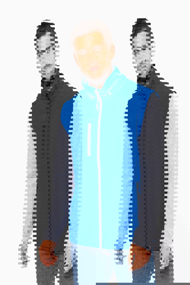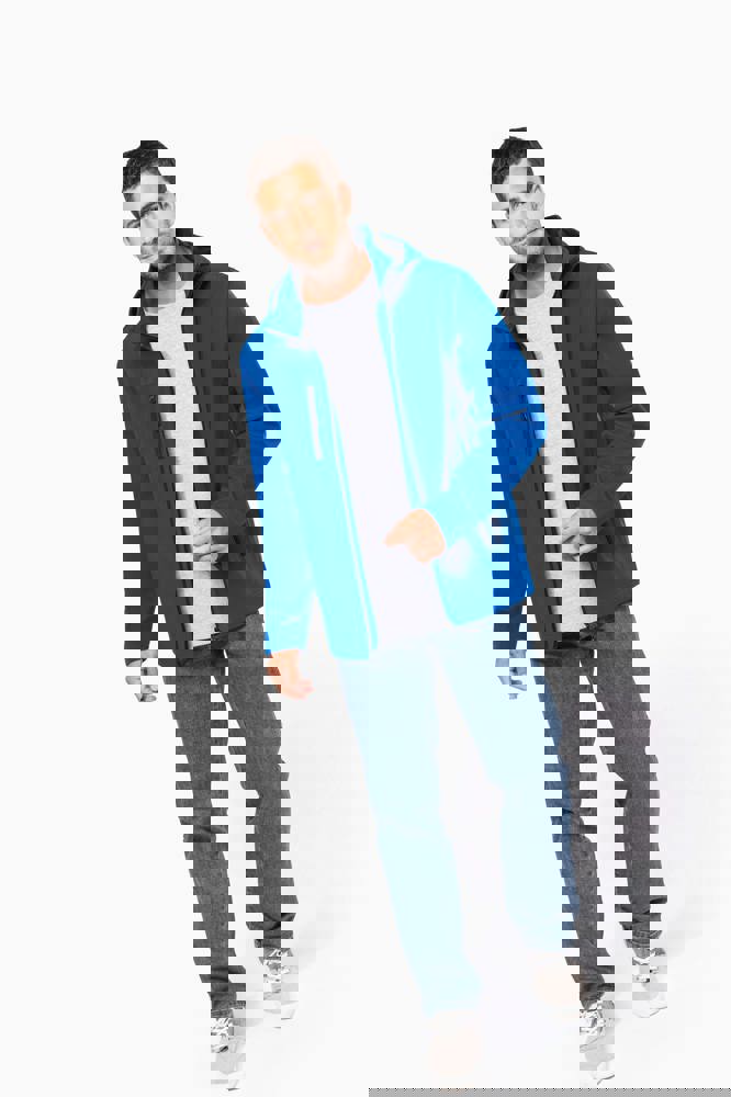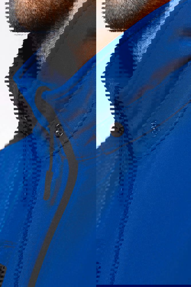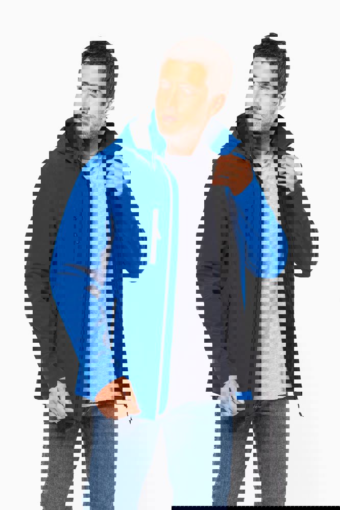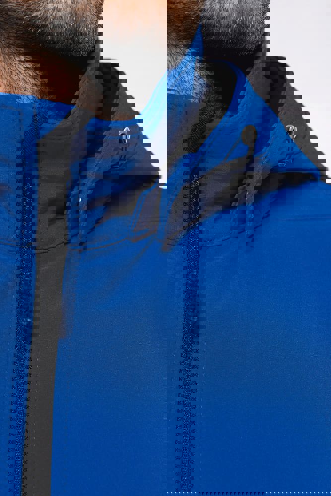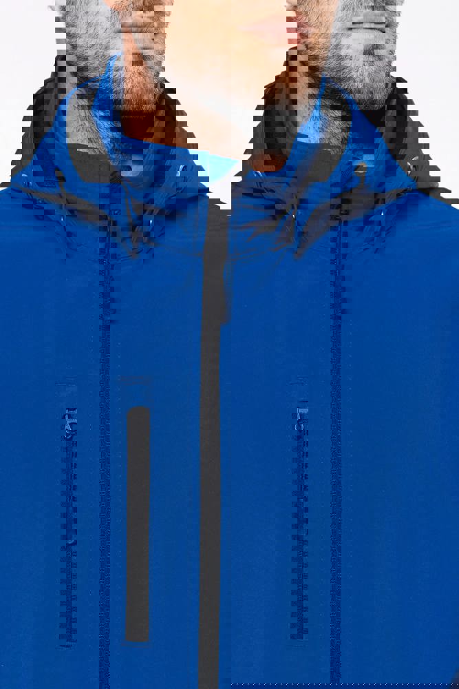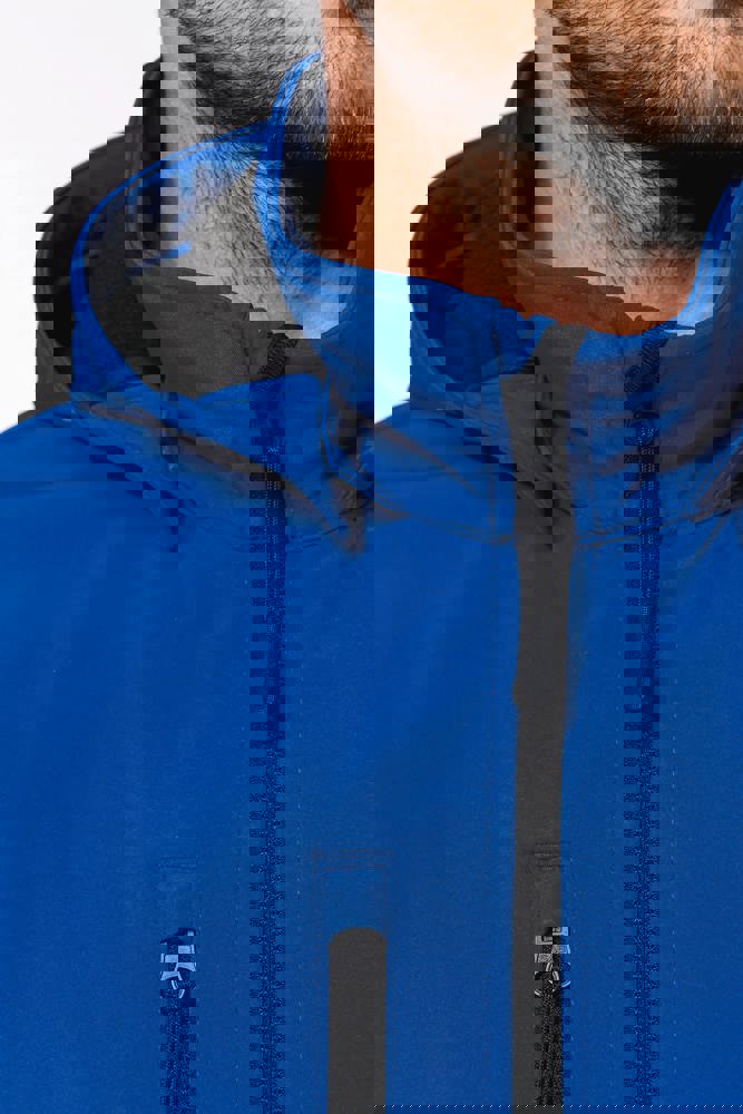 95 % Polyester / 5 % Elasthan. Atmungsaktives, 3-lagiges Verbundgewebe. 3.000 g/m²/24 h und wasserdicht 8.000 mm. Außenmaterial: 95 % Polyester / 5 % Elasthan. Atmungsaktive Mittelmembran. Innenmaterial: Mikrofleece. Leicht bedruckbarer Stoff. Gerader Schnitt. Reißverschluss. 2 Reißverschlusstaschen auf der Vorderseite und ein Reißverschlussfach auf der rechten Seite des Trägers. Über Druckknöpfe abnehmbare Kapuze mit Reißverschluss. Per Reißverschluss abnehmbare Ärmel. Doppelnähte an Ärmelbündchen und unterem Saum.