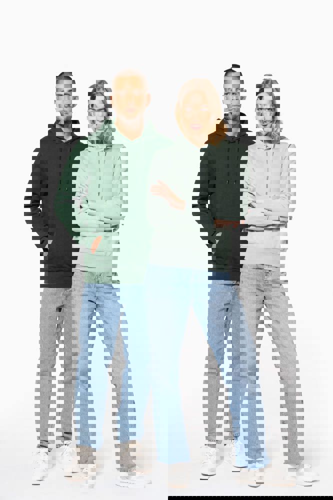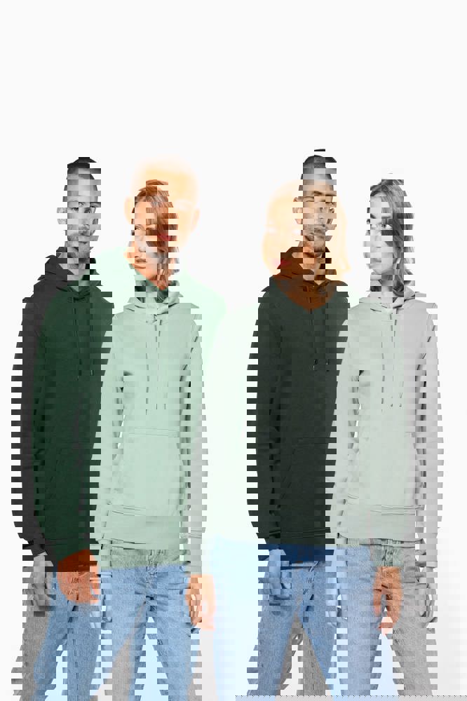 85 % Baumwolle / 15 % Polyester. Aus 85 % biologischer Baumwolle und 15 % recyceltem Polyester post-consumer. Außenseiteaus 100% Baumwolle. Gebürstetes Fleece mit 3 Nähten und LSF-Behandlung (Low Shrinkage Fleece). Gekämmte Baumwolle. Enzymwäsche veredelt. Gerader Schnitt. 1x1 schlauchförmige Strickbündchen für eine optimale Verarbeitung an den Ärmelabschlüssen und am unteren Saum. Kängurutasche. Gefütterte Kapuze aus 100 % Baumwolle, Baumwolljersey 180 g. Ton-auf-Ton Jersey-Nackenband und Halbmond-Finish auf der Krageninnenseite. Doppelnähte an Ärmelbündchen, Saum und Kraten. Kein Markenetikett am Kragen, nur Größenkennzeichnung, für eine leichtere Veredelung.
