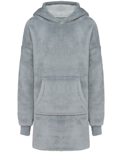 100 % Polyester. Oversize-Schnitt mit überschnittener Schulterpartie. Doppelseitiger Stoff, Außenseite aus Velours, Innenseite aus Sherpa. Auf der Vorderseite gekreuzte Kapuze mit zwei Einsätzen und Finish mit doppelter Ziernaht. Lange Ärmel mit 1x1-Rippstrickbündchen, die für eine bessere Verarbeitung mit einem Schlauchfinish gefüttert sind. Elasthan in Strickbündchen an den Ärmelabschlüssen, um Verformungen zu vermeiden. Kängurutasche. Unterer Saum mit doppelter Ziernaht. Kein Markenetikett am Halsausschnitt, nur eine abreißbare Größenangabe, zur einfacheren Veredelung.