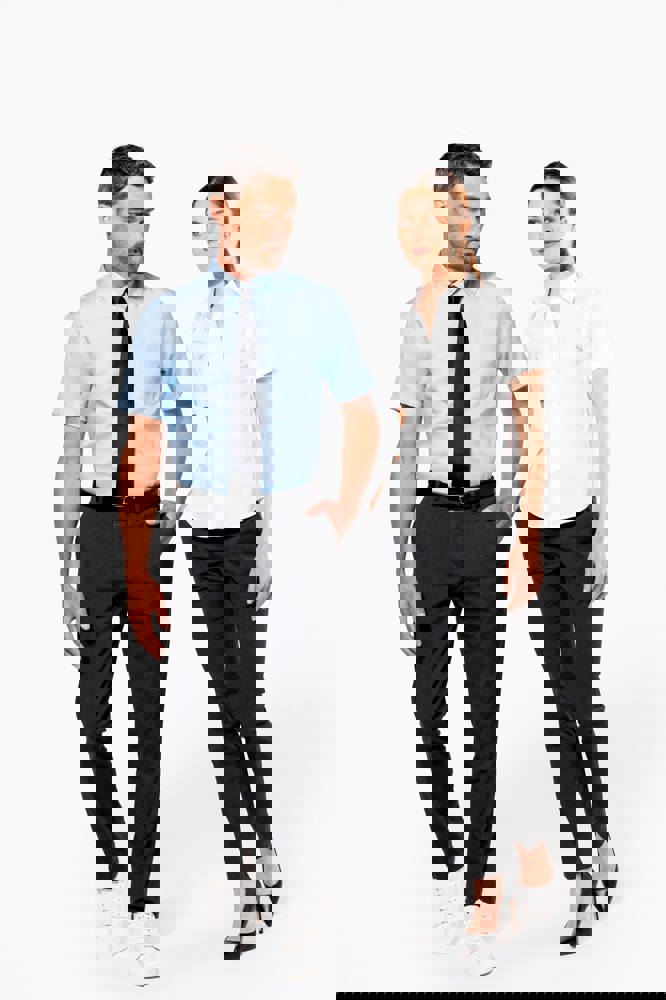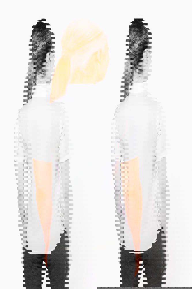 100% Baumwolle Micro Twill. Bügelfreie Bluse. Klassischer, knopfloser Kragen. Farblich abgestimmte Knöpfe. Nahtloser Saum an der Knopfleiste. 1 Ersatzknopf. Abgerundeter Saum.