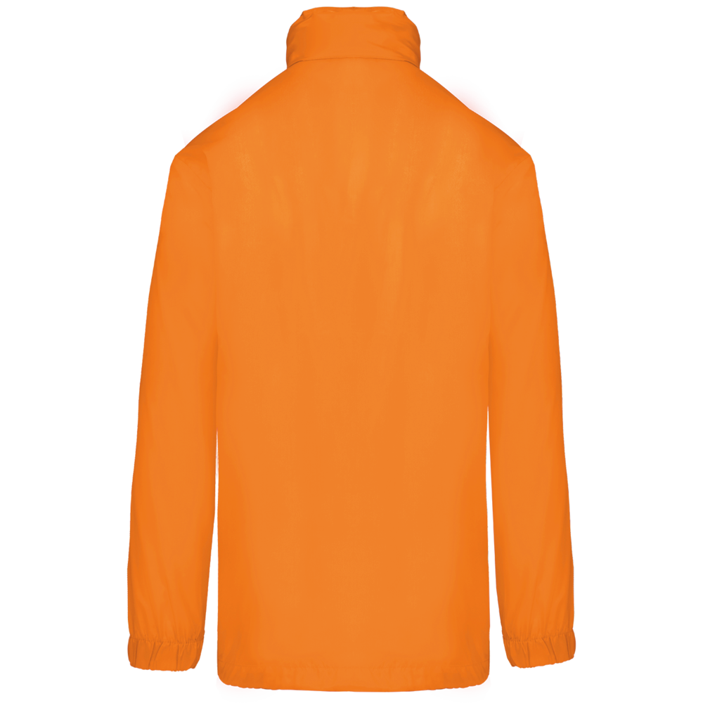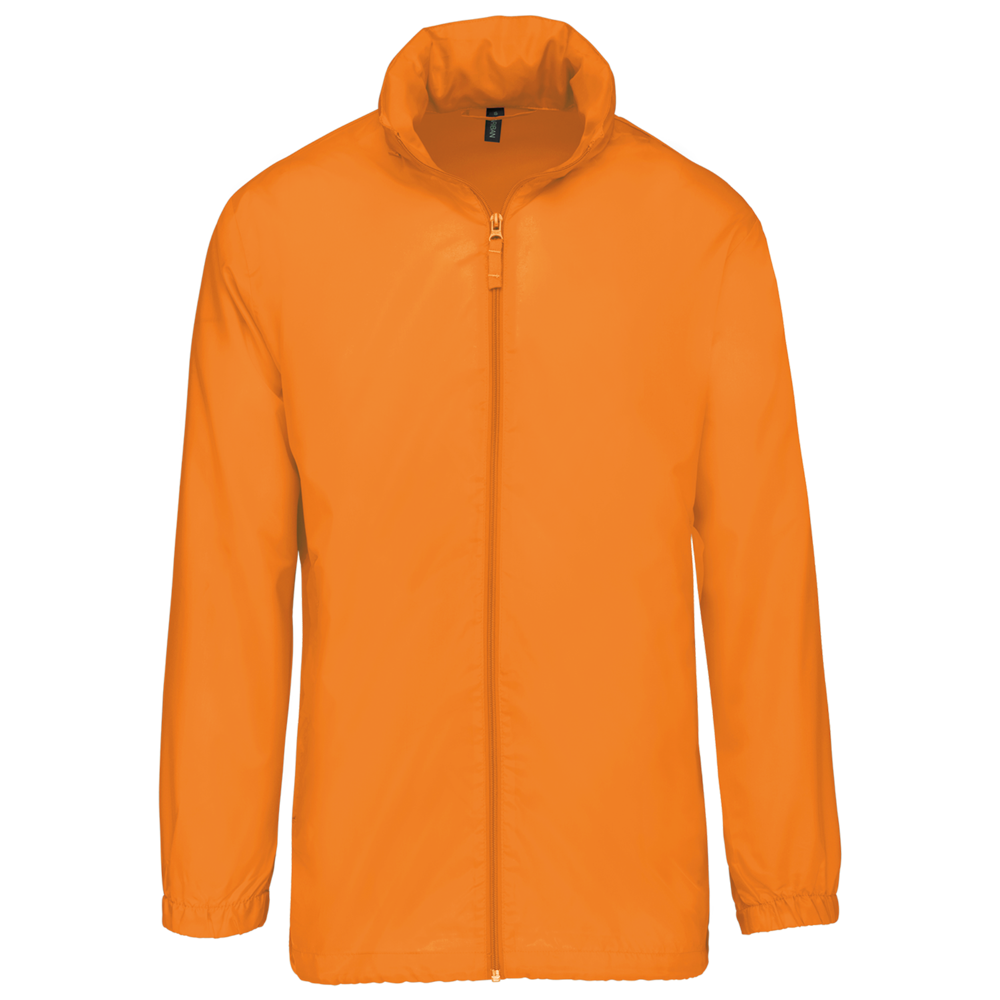 100% Polyester. Im Kragen versteckte Kapuze, mit Klettverschluss. 2 Fronttaschen mit Reißverschluss. Kordelzug am Bund. Gummizug am Ärmelende. Zusammenfaltbar in die Seitentasche (K-WAY® System). Reißverschluss Ton-in-Ton.