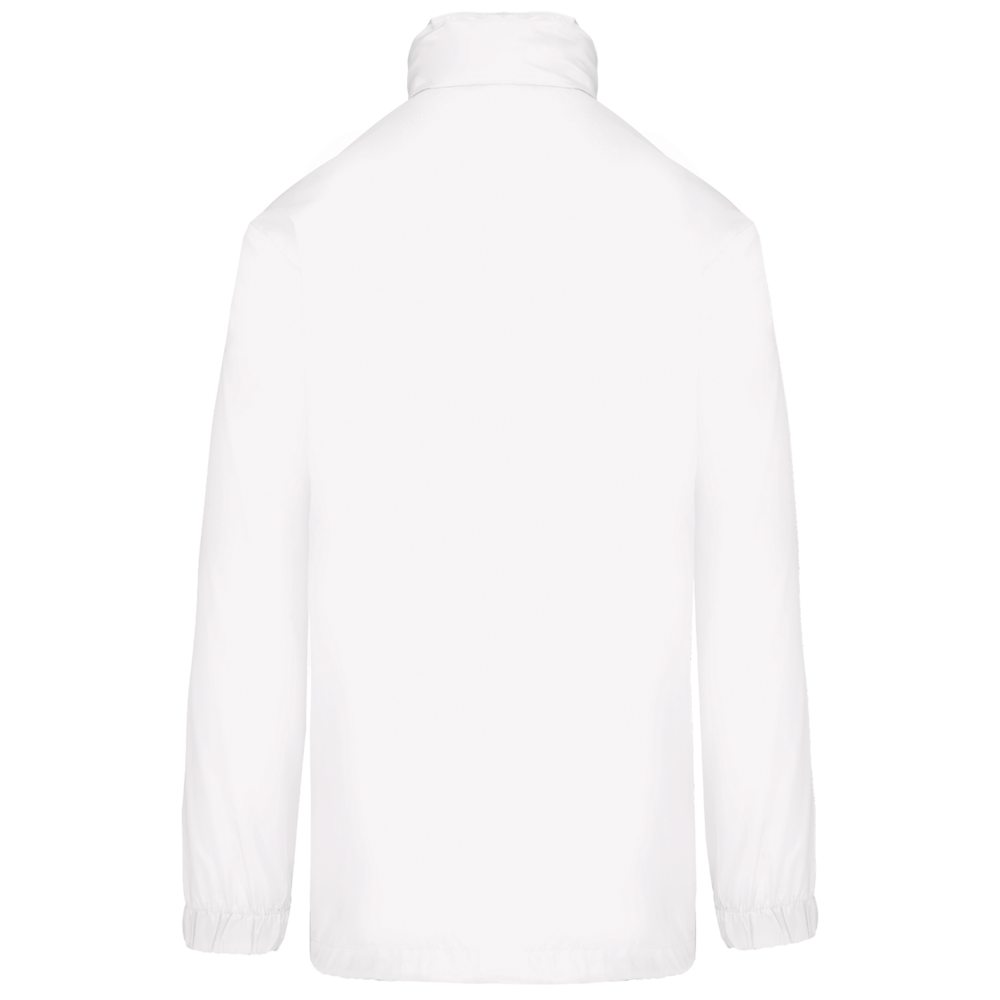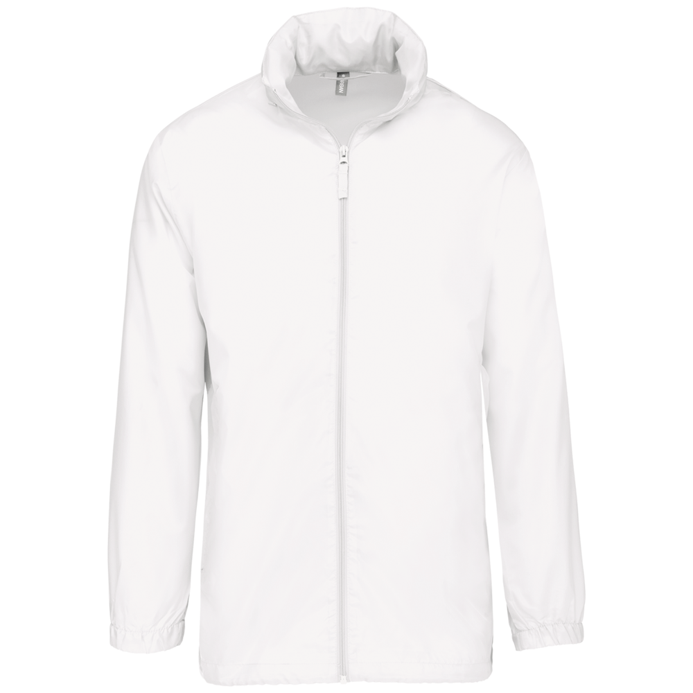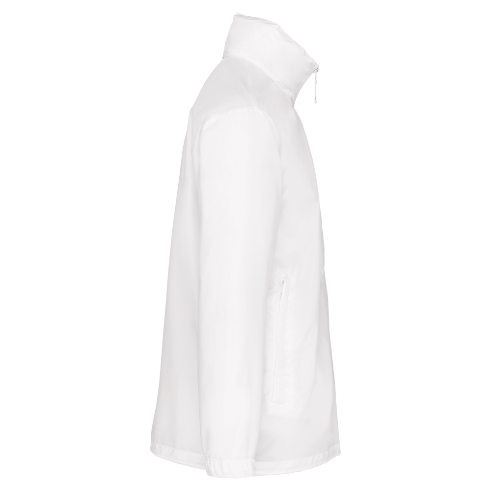 100% Polyester. Im Kragen versteckte Kapuze, mit Klettverschluss. 2 Fronttaschen mit Reißverschluss. Kordelzug am Bund. Gummizug am Ärmelende. Zusammenfaltbar in die Seitentasche (K-WAY® System). Reißverschluss Ton-in-Ton.