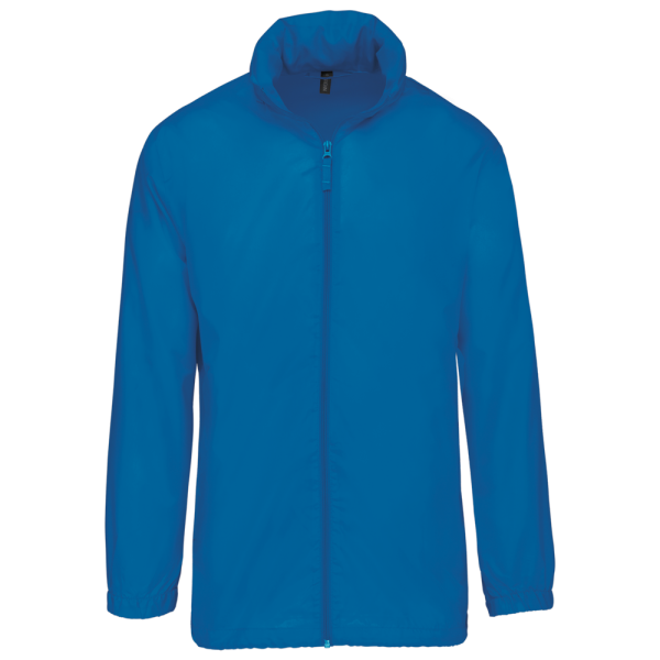100% Polyester. Im Kragen versteckte Kapuze, mit Klettverschluss. 2 Fronttaschen mit Reißverschluss. Kordelzug am Bund. Gummizug am Ärmelende. Zusammenfaltbar in die Seitentasche (K-WAY® System). Reißverschluss Ton-in-Ton.