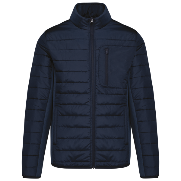 Stoff an Seiten, Rücken, Unterseite der Ärmel und Teil des Kragens: 94 % Polyester/6 % Elasthan. Oberstoff Ärmel, Vorder- und Rückseite: 100% Polyester Pongé 300T mit Polyurethan-Beschichtung. Füllung 100% Polyester 120g. Futter aus 100% recyceltem Polyester Taft 230T. Vorderer Körperteil und hinteres Drittel gepolstert. Vorderseite mit umgekehrtem Nylon-Reißverschluss. 2 seitliche und paspelierte Taschen auf Vorderseite. Aufgesetzte Brusttasche auf der Herzseite, die mit einem umgekehrten Reißverschluss geschlossen wird. Kragen mit Einsätzen aus zwei Materialien. Elastisches Schrägband an Ärmelbündchen und unterem Saum.