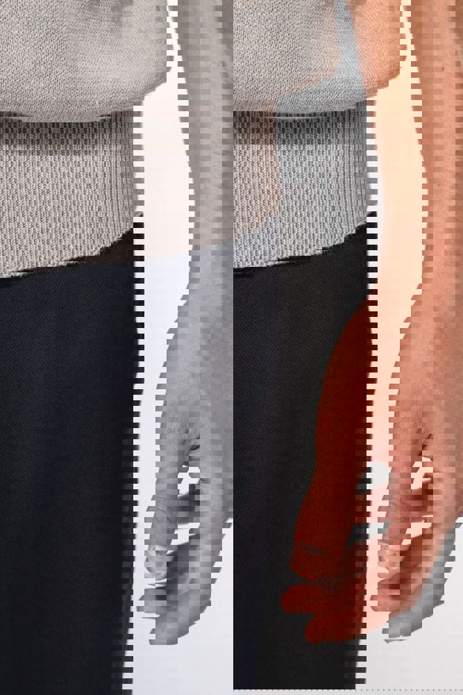 50% Baumwolle / 50% Acryl. Gerader Schnitt. Gedoppelter Rippstrickkragen und Ärmel. Nackenband.