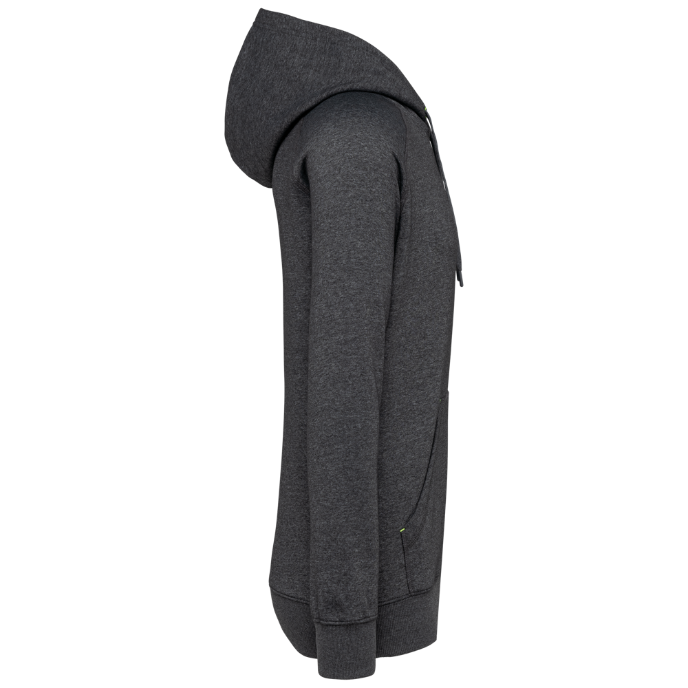 65 % Polyester/35 % Baumwolle. Vortex-Faden. Gebürsteter Molton. Gekämmte Baumwolle. Gerader Schnitt. Raglanärmel. Nylon-Reißverschluss. Gefütterte Kapuze aus Ton-in-Ton-Netzstoff. Kängurutaschen mit fluoreszierender Handytasche. Nackenband auf der Innenseite der Kapuze, Ösen der Kordel der Kapuze und Vertiefungen in fluoreszierenden Farben auf den Taschen. 2 x 2 doppelte Rippstrickbündchen an den Ärmeln und am unteren Saum. Halbmondförmiger Halsausschnitt auf der Rückseite für eine einfache Markenveredelung auf der Innenseite. Markenetikett zum Abreißen.