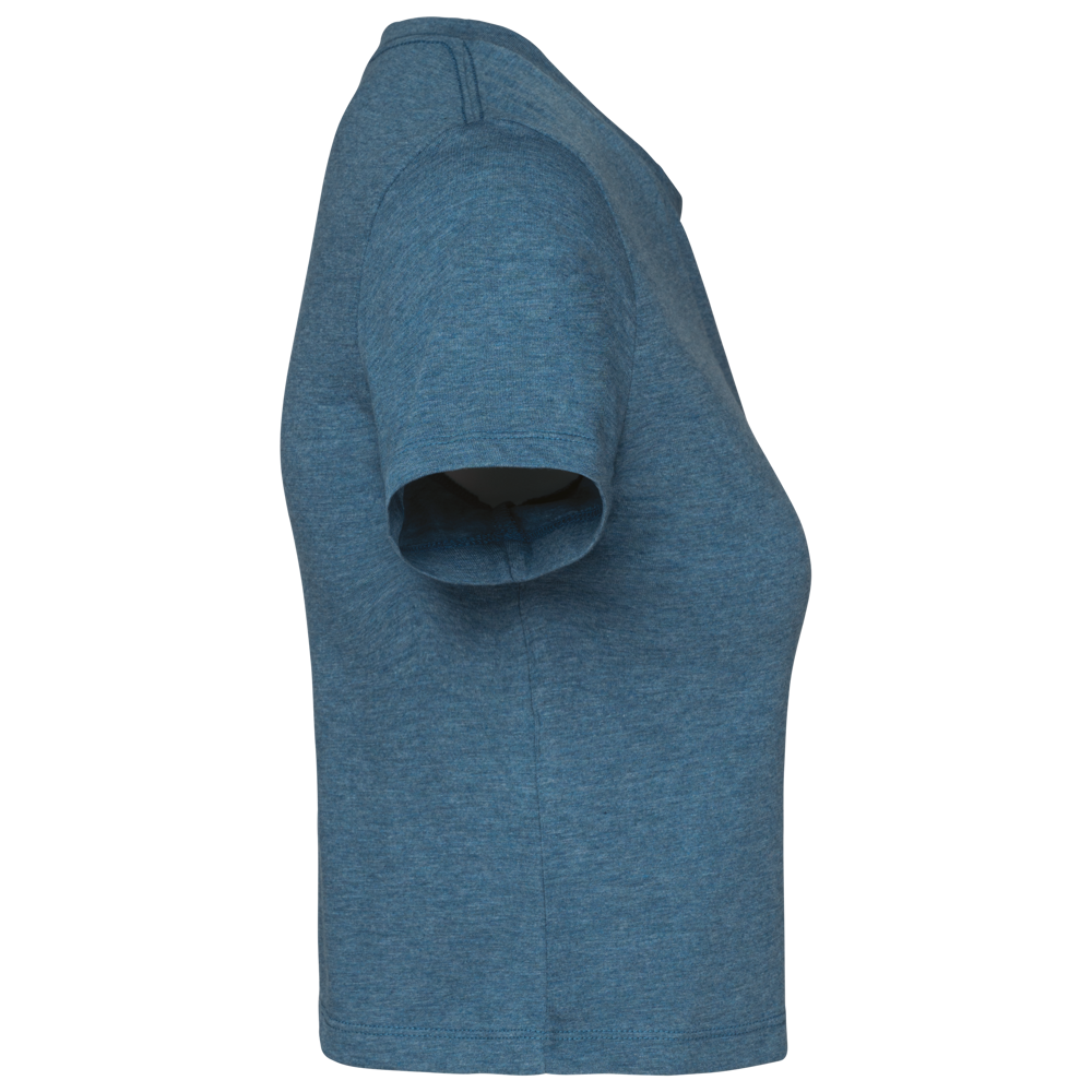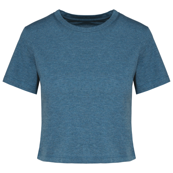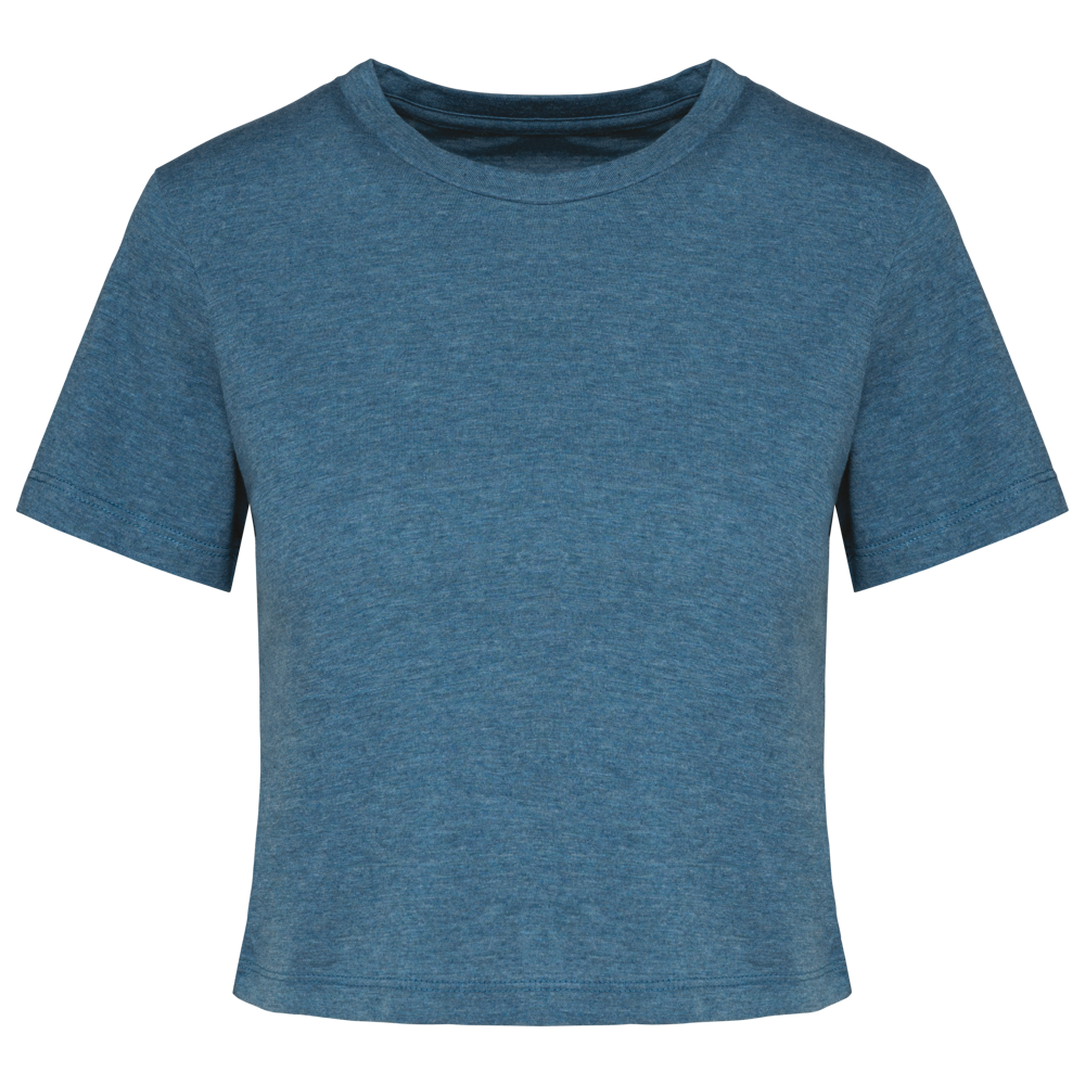 50 % Polyester / 25 % Baumwolle / 25 % Viskose. Jerseystoff. Anti-Pilling-Behandlung. Rundhalsausschnitt. Gerader Schnitt. Crop Top. Farblich abgestimmtes Nackenband. Doppelnähte am Saum und Ärmelabschluss. Gerader Saum an Ärmelabschlüssen. Kein Markenetikett, nur Größenangabe, zur einfacheren Veredelung.