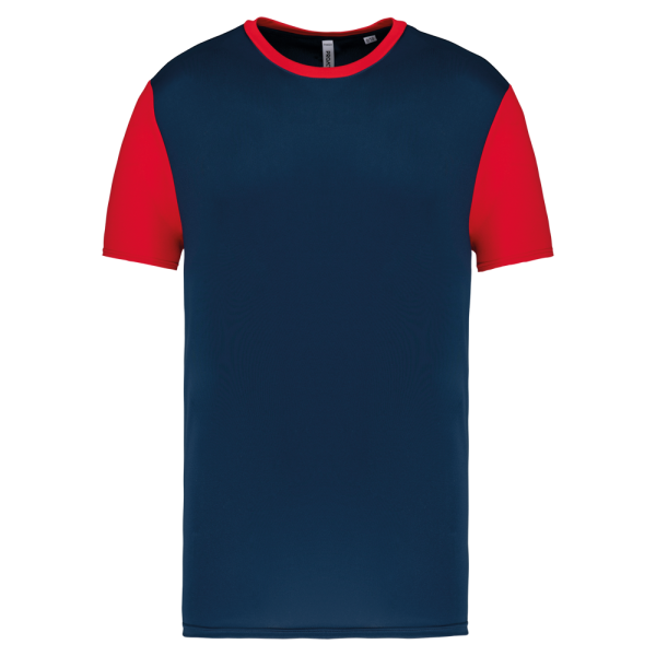 100% Polyester. Verriegelungsgitter. Gerader Schnitt. Kontrastierender Rundhalsausschnitt und Sauberkeitsband. Kontrastierende gerade Ärmel. Doppelnadelfinish an den unteren Ärmeln und am Kleidungsstück.