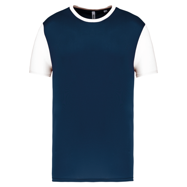 100% Polyester. Verriegelungsgitter. Gerader Schnitt. Kontrastierender Rundhalsausschnitt und Sauberkeitsband. Kontrastierende gerade Ärmel. Doppelnadelfinish an den unteren Ärmeln und am Kleidungsstück.