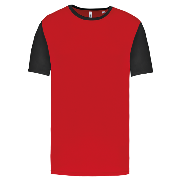 100% Polyester. Verriegelungsgitter. Gerader Schnitt. Kontrastierender Rundhalsausschnitt und Sauberkeitsband. Kontrastierende gerade Ärmel. Doppelnadelfinish an den unteren Ärmeln und am Kleidungsstück.