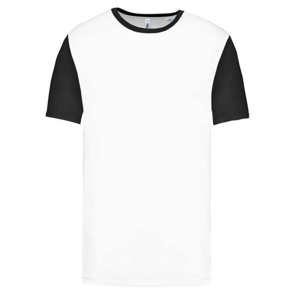 100% Polyester. Verriegelungsgitter. Gerader Schnitt. Kontrastierender Rundhalsausschnitt und Sauberkeitsband. Kontrastierende gerade Ärmel. Doppelnadelfinish an den unteren Ärmeln und am Kleidungsstück.