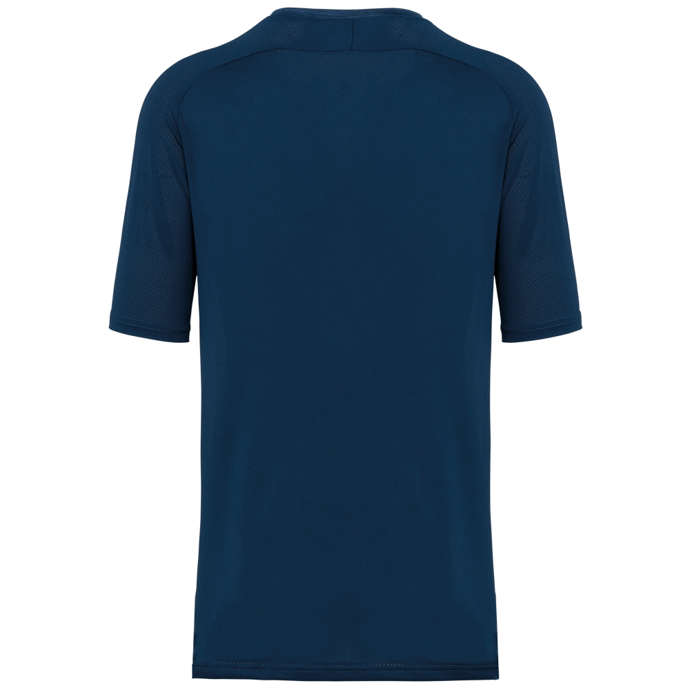 90 % Polyester/10 % Elasthan. Birdseye-Teil: 92 % Polyester/8 % Elasthan. Kontrastfarbenes Panel aus „Birdseye“-Strick. Gerader Schnitt. Raglanärmel. Rundhalsausschnitt aus Jerseytrikot mit farblich abgestimmtem Einsatz vorn am Ausschnitt. Farblich abgestimmtes Jersey-Nackenband. Kontrastfarbene Einsätze (oder einfarbig für die Farbe Black) mit Birdseye-Strick an Seiten, Ärmeln und Rücken. Doppelnähte an den Ärmelabschlüssen und am unteren Saum. Tear-away-Markenetikett.