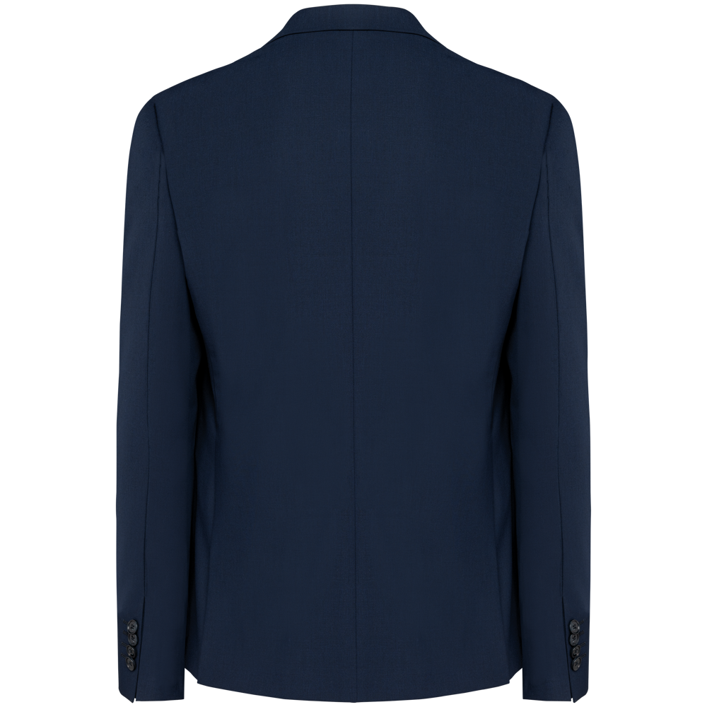 50 % Polyester / 23 % Viskose / 22 % Wolle / 5 % Elasthan. Ton-in-Ton-Futter aus Twill (100 % Polyester). Gerader Schnitt. Jacke mit zwei Ton-in-Ton-Knöpfen. Zwei paspelierte Taschen mit Patten sowie eine paspelierte Brusttasche auf der linken Seite. Falsche Knopfleiste (Ton-in-Ton) auf dem Revers des Kragens. Seitlicher Einsatz zur Formgebung. Lasche aus Satin am Halsausschnitt. Naht in Rückenmitte und zwei Schlitze am unteren Saum. Ärmelbündchen mit falschem Schlitz mit 4 Ton-in-Ton-Knöpfen. Finish mit kontrastfarbenem Schrägband an den beiden inneren Brusttaschen. Paspelierte Handytasche und Tickettasche (Ton-in-Ton) innen auf der linken Seite. Veredelbarer Reißverschluss auf der linken Seite. Kein Markenetikett, nur Größenangabe, zur einfacheren Veredelung.