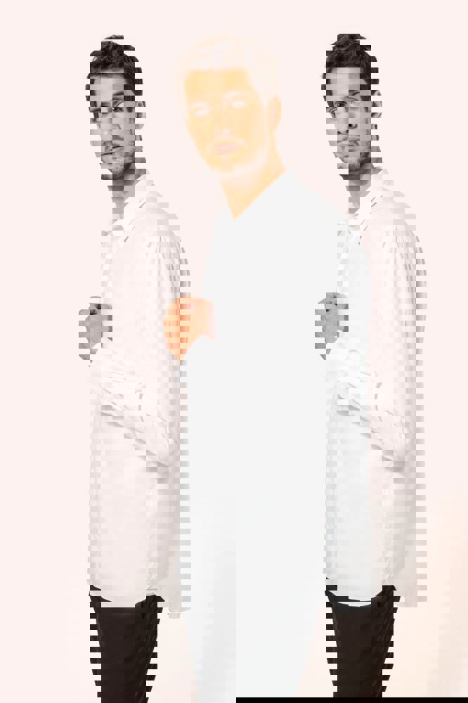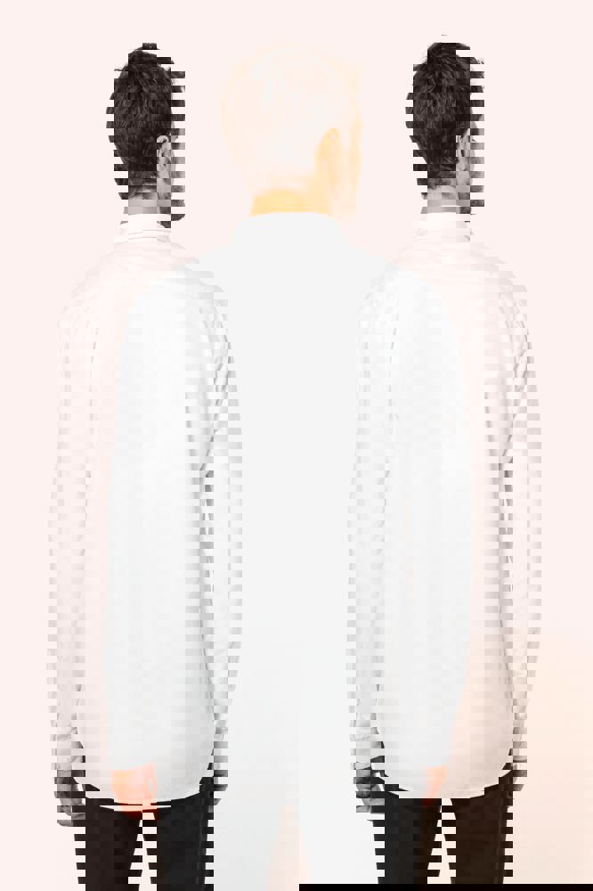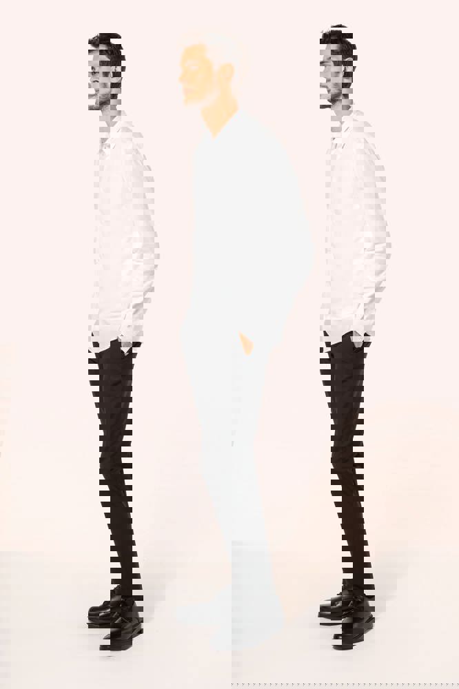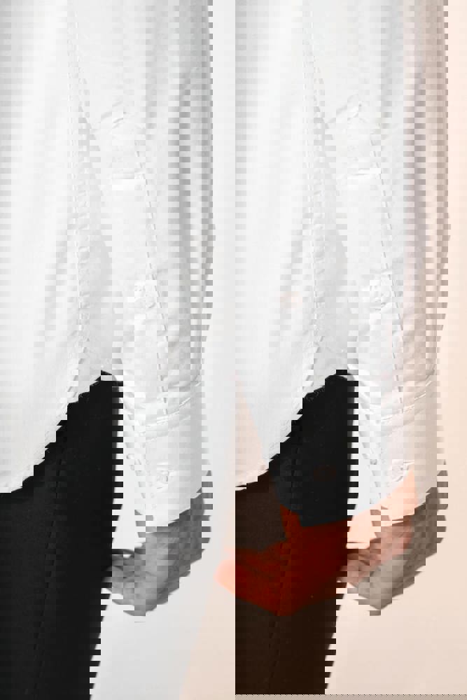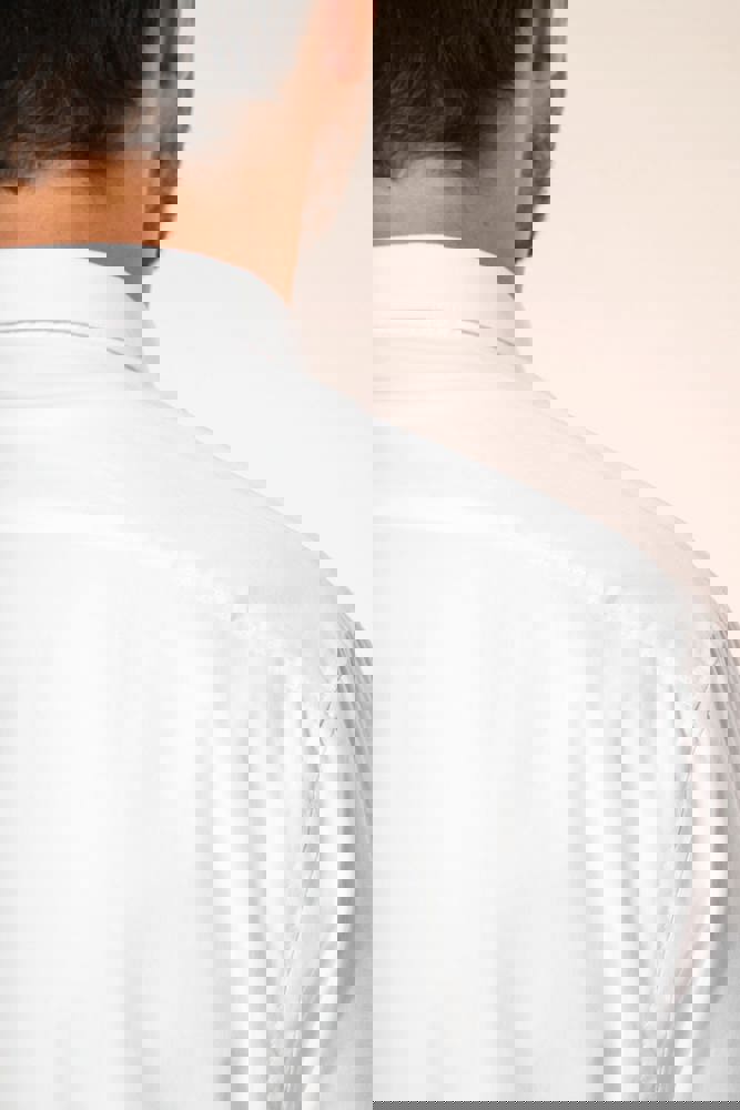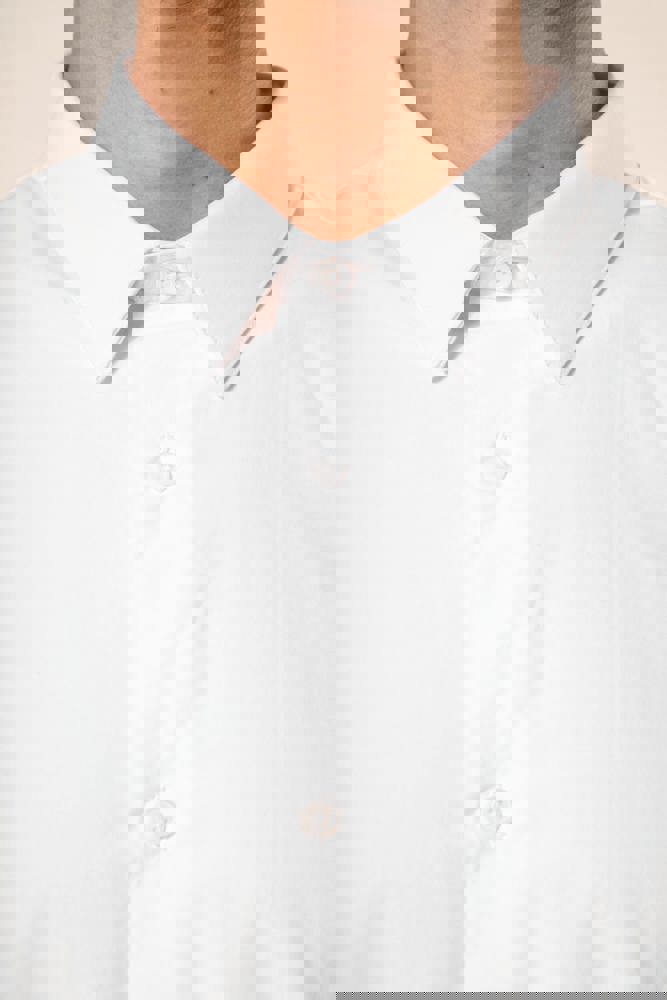 100 % Bio-Baumwolle. Popeline. Französischer Kragen mit abnehmbaren Kragennadeln. Perlmuttknöpfe. Passe am oberen Rücken. Gerade Manschette mit 2 Knöpfen. Zwickel an den Seiten. Kein Markenetikett, nur Größenkennzeichnung, für eine leichtere Veredelung.