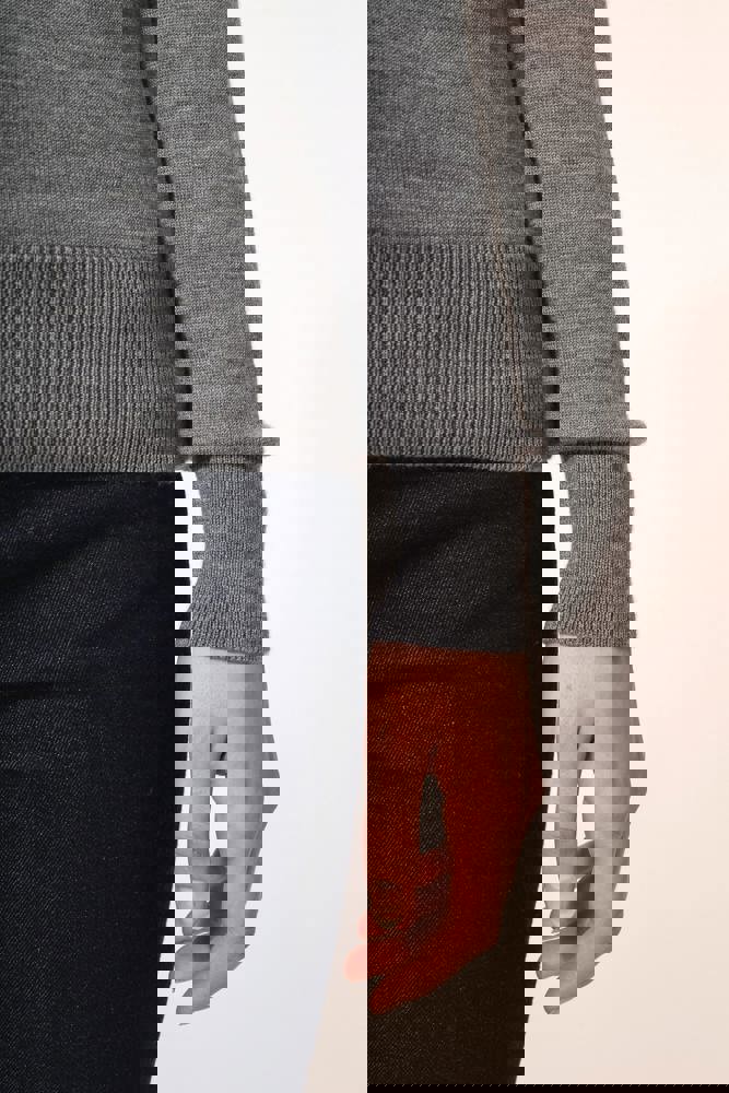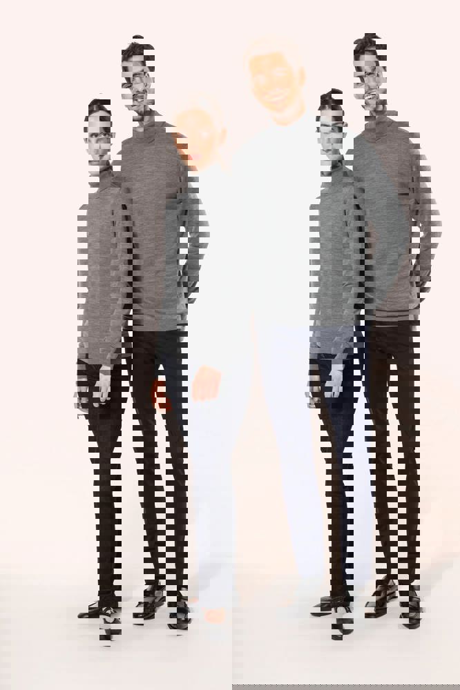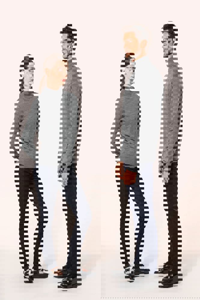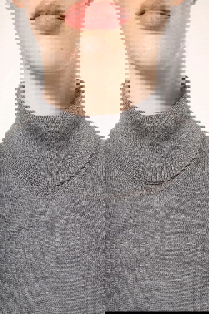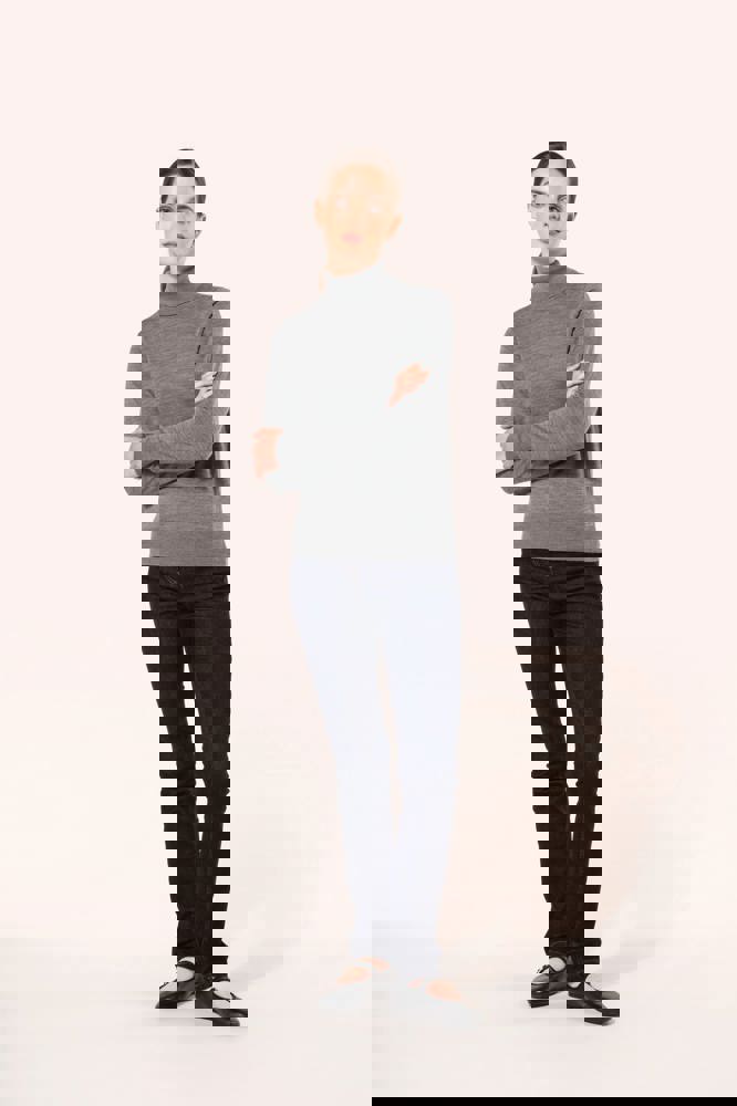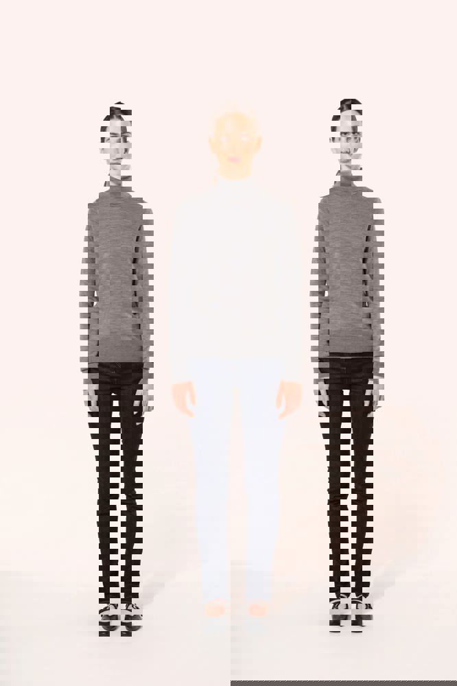 100 % Merinowolle. Extra feine, gekämmte Wolle. 14 gg Strick. Fully-fashioned: In der Form gestrickt und mit einer Mesh-Maschine zusammengesetzt. 1 x 1 Rippstrick an Rollkragen und Saum.