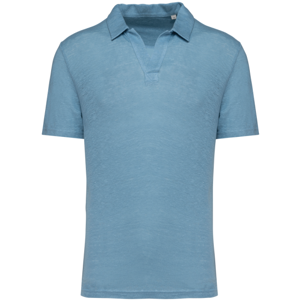 100 % Leinen. Strick. Gerader Schnitt. Kragen mit Kragensteg und stoffgleichem knopflosem Polohemd V-Ausschnitt. Doppel-Ziernaht an Ärmelbündchen und Saum. Halbmondpasse am Rücken. Seitliche Schlitze mit stoffgleichem Schrägband auf der Innenseite.