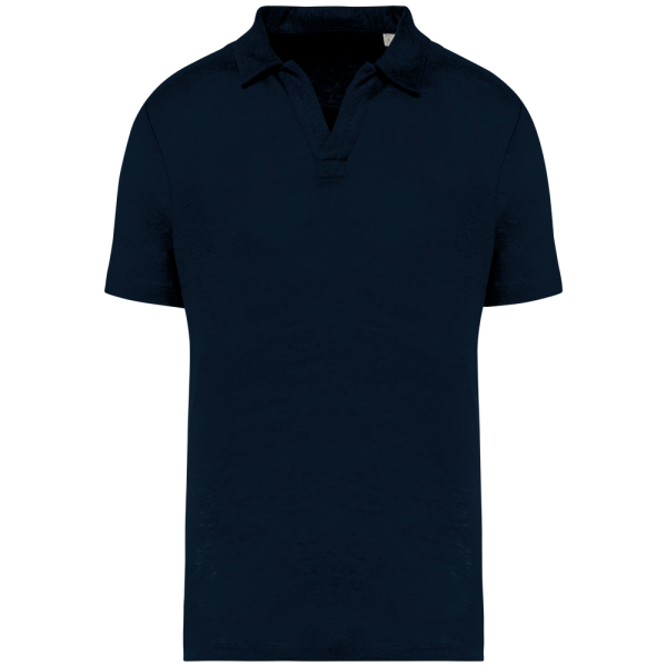 100 % Leinen. Strick. Gerader Schnitt. Kragen mit Kragensteg und stoffgleichem knopflosem Polohemd V-Ausschnitt. Doppel-Ziernaht an Ärmelbündchen und Saum. Halbmondpasse am Rücken. Seitliche Schlitze mit stoffgleichem Schrägband auf der Innenseite.