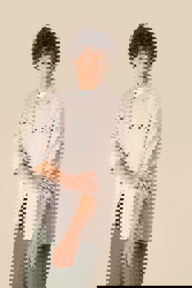 100 % Leinen. Gewebt. Gerader Schnitt. Ausgewaschener Look. Knopfleiste mit farblich abgesetzten... mehr
