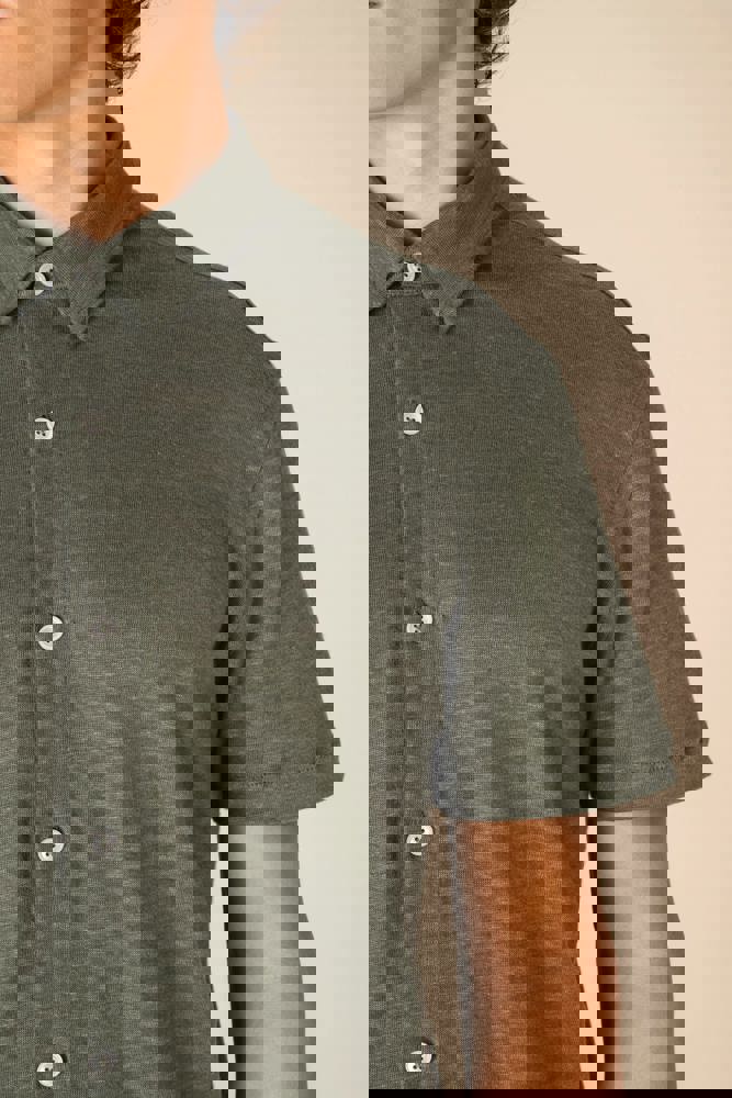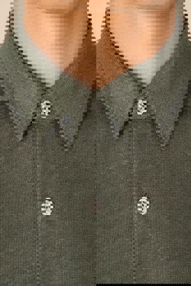 100% Leinen. Strick. Gerader Schnitt. Kragen mit Kragensteg. Rückenpasse. Mit einfacher Ziernaht an Ärmelbündchen und unterem Saum. Knopfleiste mit kontrastierenden Knöpfen aus recyceltem Kunststoff mit Perlmutt-Optik bei allen Farben.