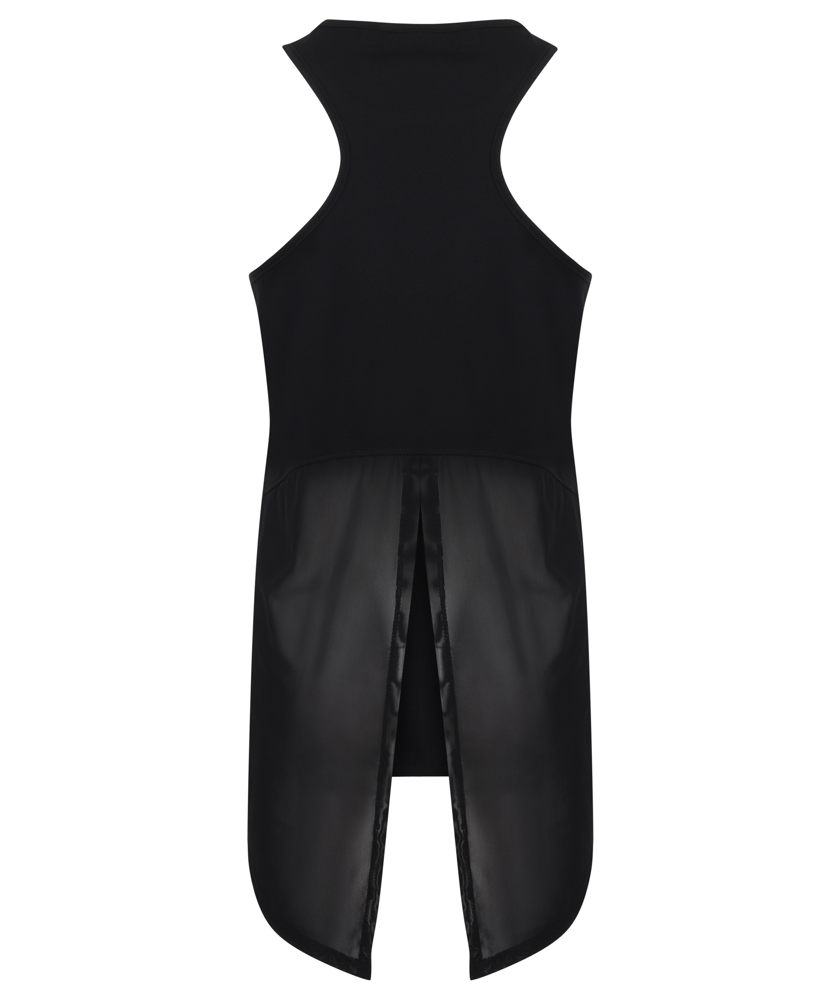 Body: 65 % Polyester / 35 % Rayon 145g/m² Mesh (90 g/m²): 88 % Polyester / 12 % Elasthan. Weicher, Single-Jersey-Stoff. Abgesetzter Kragen und Armlöcher. Weiter Racer-Back mit nach vorn verlaufenden Schulternähten. Langer feiner Rückenschlitz mit Mesh, der offen oder gebunden getragen werden kann. Geschwungene Rückenteilform ab Schlitz. Tearout-Label.