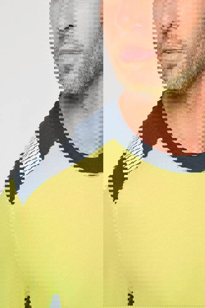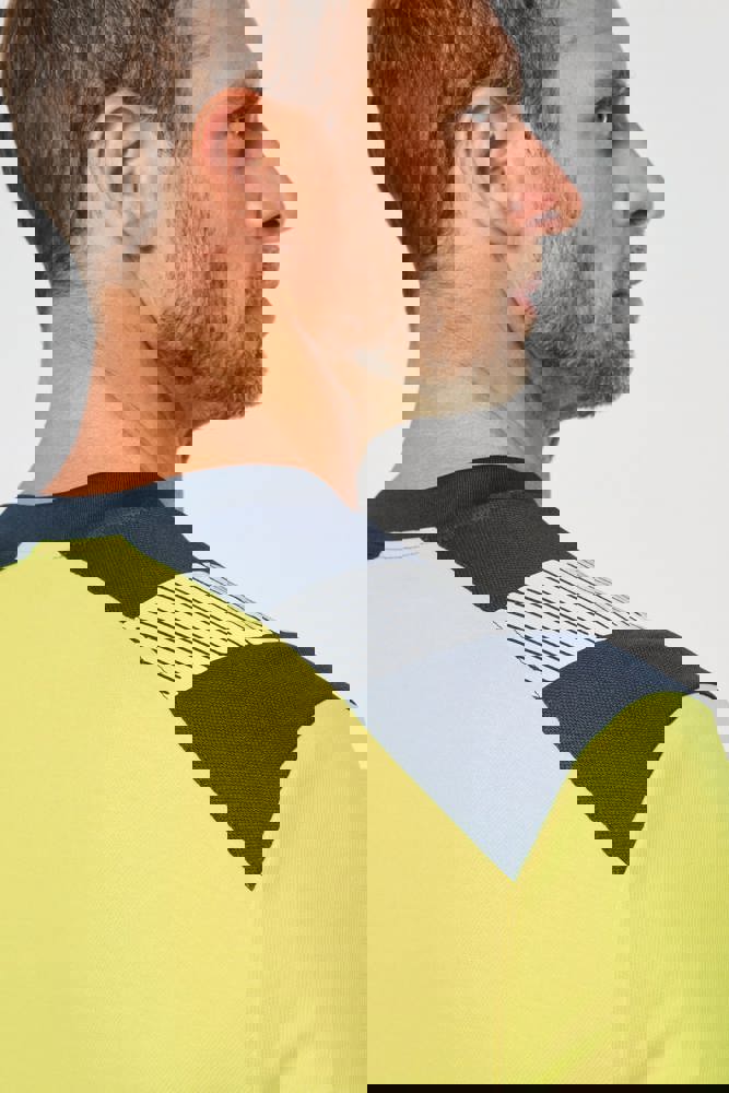 50 % Baumwolle / 50 % recyceltes Polyester. Gekämmte Baumwolle. Pikeetrikot. Anti-Pilling-Behandlung. Waschen 60°C (25 Zyklen). Reguläre Passform. Kontrastfarbene Schultereinsätze mit 5 cm breitem, retroreflektierendem Segmentstreifen. Gefütterter Kragen aus 100% recyceltem Polyester in 1x1 Strickbündchen. Kontrastfarbener Saum der langen Ärmel mit 1x1-Strickbündchen. Kontrastfarbener, mikrobelüfteter Unterarmeinsatz aus Birdseye 100% recyceltem Polyester. 2 segmentierte, retroreflektierende Streifen von 5 cm vorne, hinten und an den Ärmeln. Kontrastfarbener Saum. Doppelnaht am unteren Saum. EPI Klasse II. Normen NF EN 13758-1+A1:2007 + NF EN 13758-2+A1:2007: Schutz UPF40+ (Schutzeigenschaft gegen UV-Strahlung der Sonne), NF EN ISO 13688:2013 + NF EN ISO 13688/A1:2021 (Schutzkleidung - Allgemeine Anforderungen), NF EN ISO 20471:2013 + NF EN ISO 20471/A1:2017: Klasse 2 (Hochsichtbare Warnkleidung - Prüfverfahren und Anforderungen), RIS-3279-TOM Issue 2:2019 nur für die Farbe Hi Viz Orange/Navy (Standard für die Eisenbahnindustrie). Abtrennbares Marken-Label.