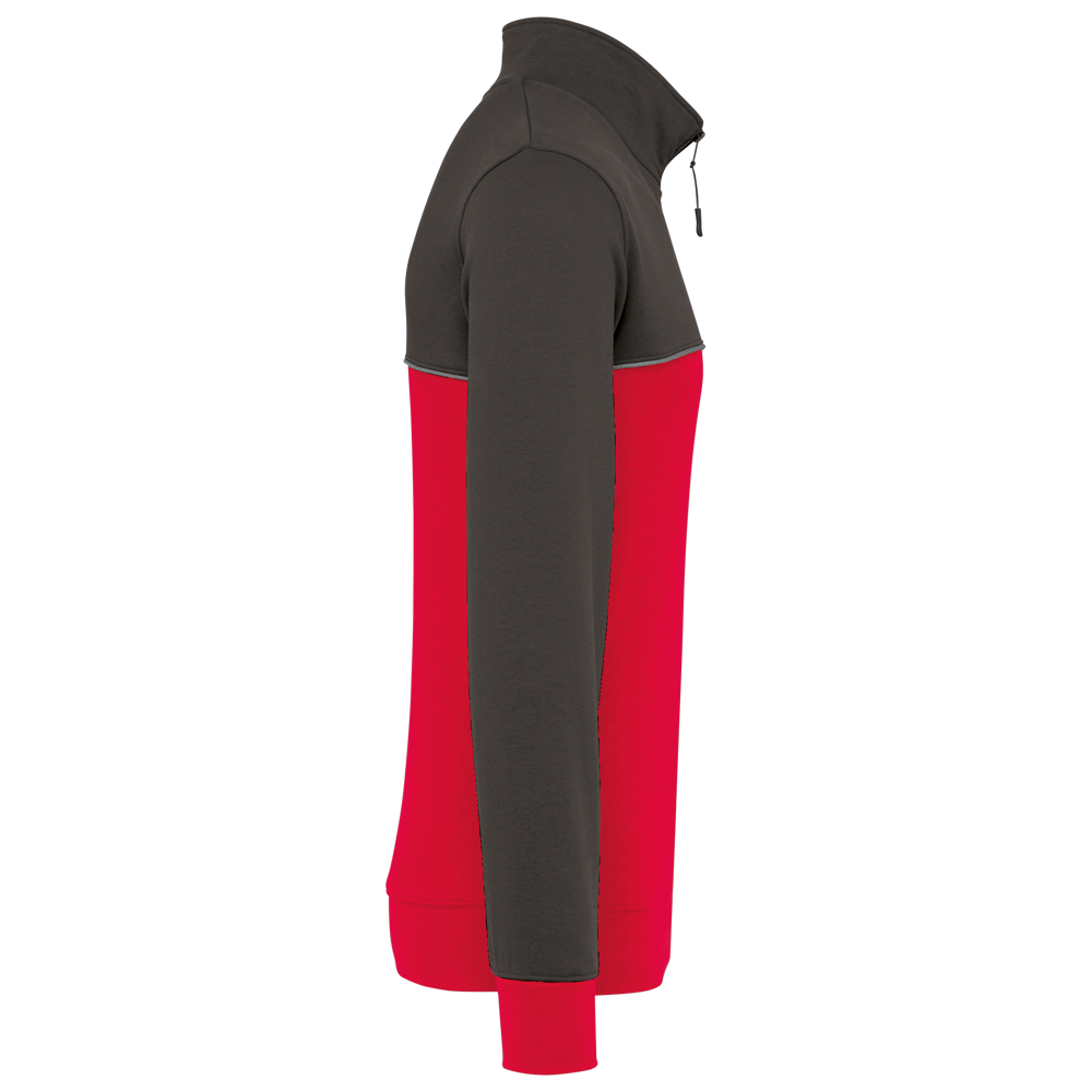60 % Baumwolle / 40 % recyceltem Polyester. Gebürsteter Molton mit 3 Nähten und LSF-Behandlung (Low Shrinkage Fleece). Gerader Schnitt. Set-in-Ärmel. Ausschnitt mit Kunststoff-Reißverschluss und recyceltem, farblich abgestimmtem Reißverschlussanhänger. Kontrastfarbenes Nackenband mit Fischgrätmuster auf der Innenseite. Halbmondförmiger Halsausschnitt auf der Rückseite für eine einfache Markenveredelung auf der Innenseite. Kontrastfarbene Paspel zwischen den zweifarbigen Elementen des Kleidungsstücks (Rumpf und Ärmel auf Vorderseite und Rücken). 1x1-Strickbündchen an Ärmeln und Saum. Elastische Stifthalterung mit 3 Fächern am linken Ärmel des Trägers. Markenetikett zum Abreißen.