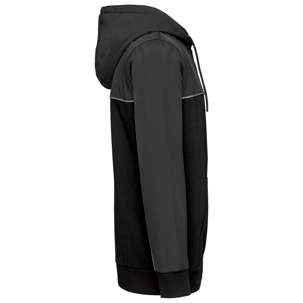 60 % Baumwolle / 40 % recycelter Polyester. Materialien für Einsätze: Softshell, 2 wasserabweisende Schichten 95 % Polyester / 5 % Elasthan. Gerader Schnitt. 2 Kängurutaschen. Zweiteilige Kapuze mit rundem Kordelzug mit Kappe aus Kautschuk. Kontrastfarbene Einsätze vorn, am Rücken und im oberen Ärmelbereich. Ton-in-Ton-Reißverschluss auf der Vorderseite. Halbmond hinten aus Softshell. Farblich abgesetzte Silber-Paspel auf Einsätzen vorn und an den Ärmeln. Aufhängeschlaufe und Nackenband im Fischgrätmuster (silber) im Kragen. Schlauchförmige 2x2 Ripp-Bündchen an Ärmelenden und unterem Saum. Abtrennbares Marken-Label.